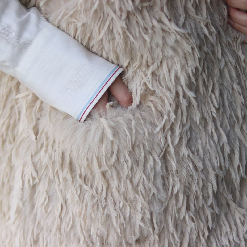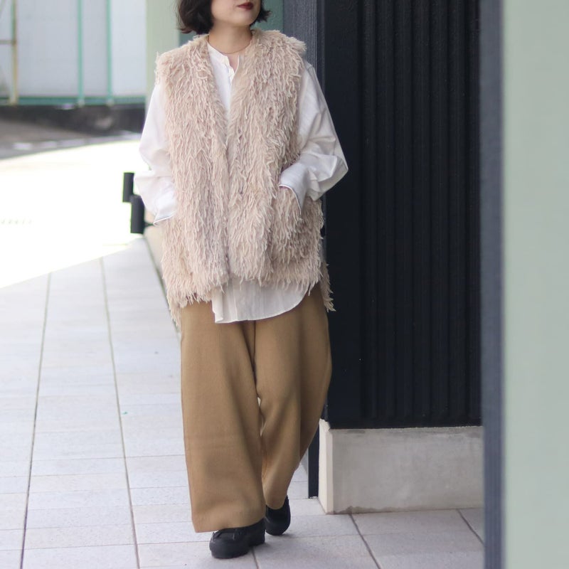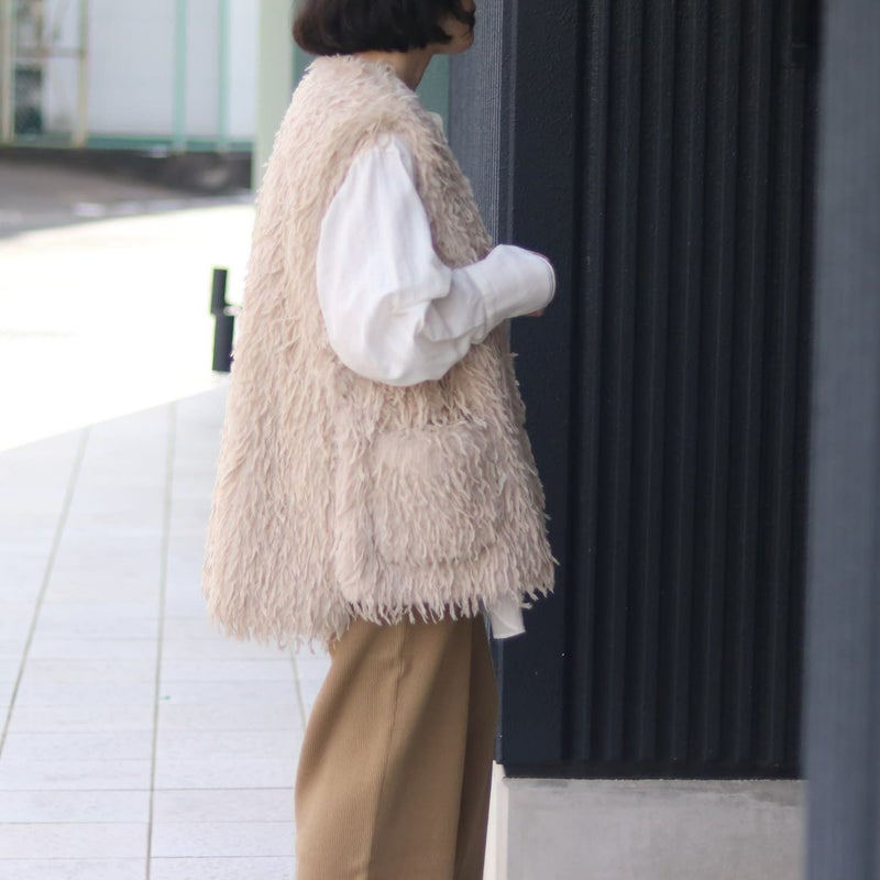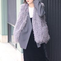 ファーとフェザーをミックスしたような、表情豊かなシャギーファー素材のジレ。