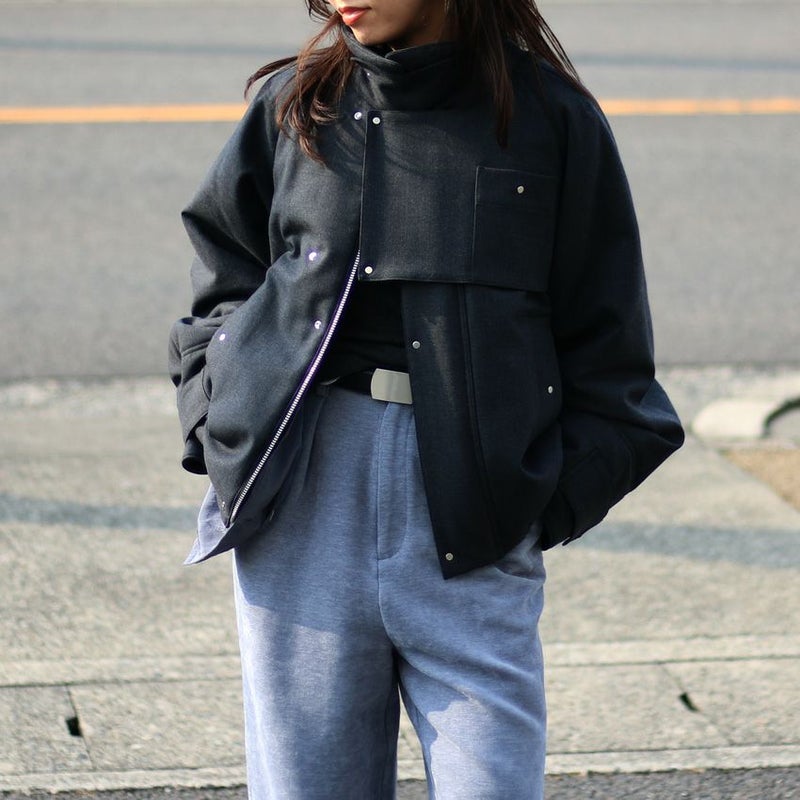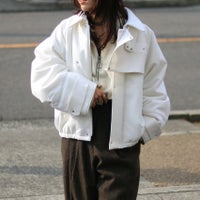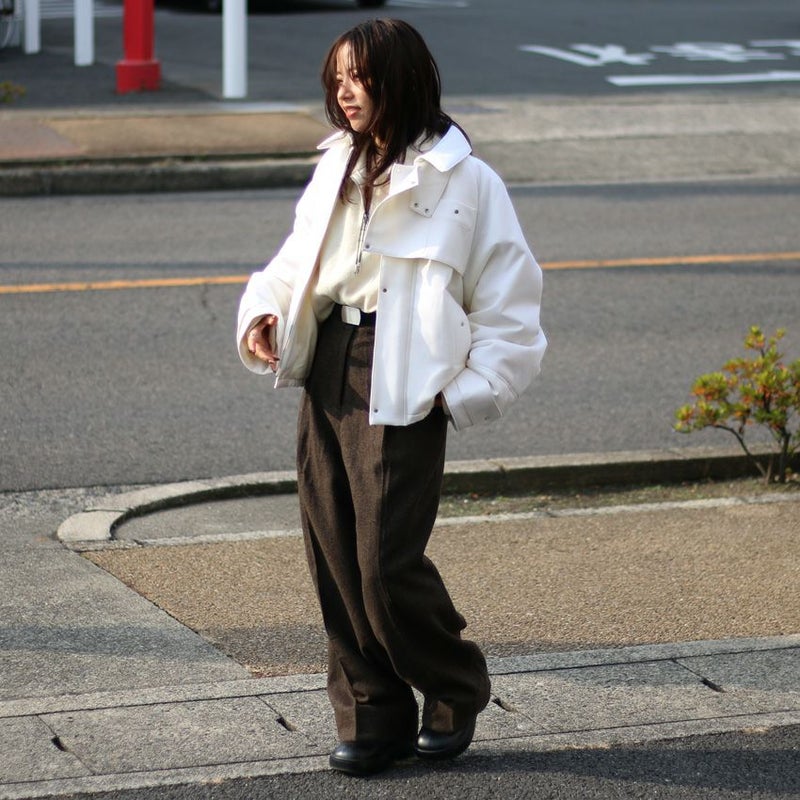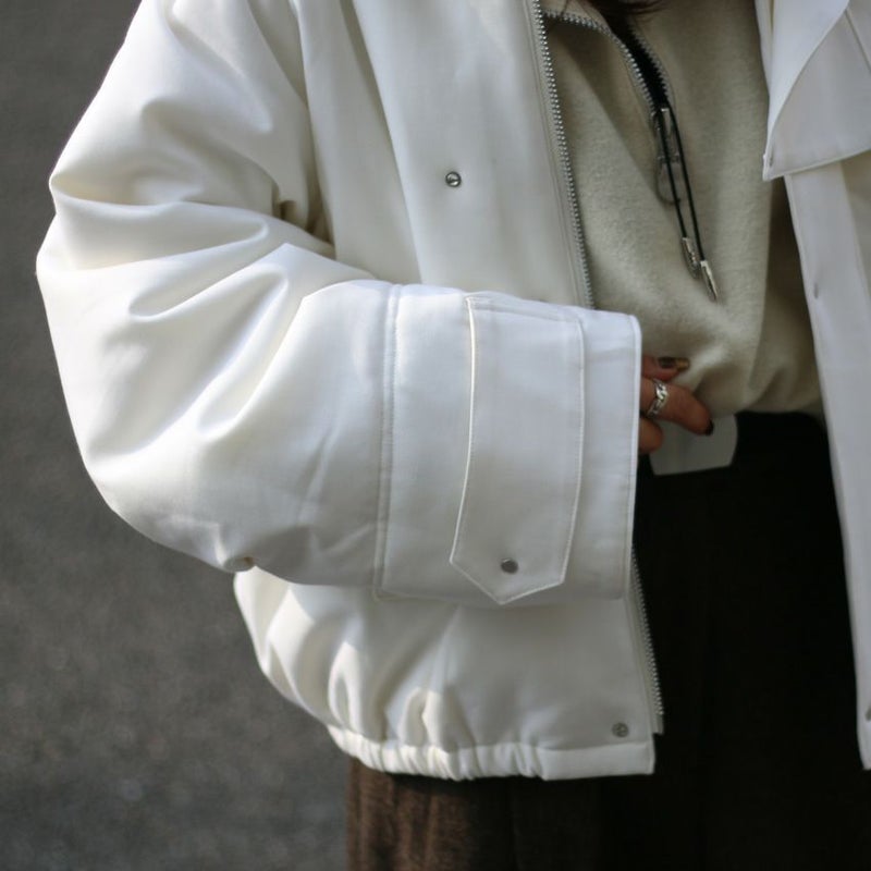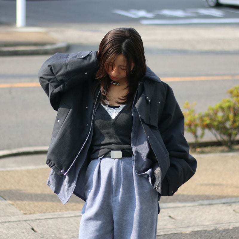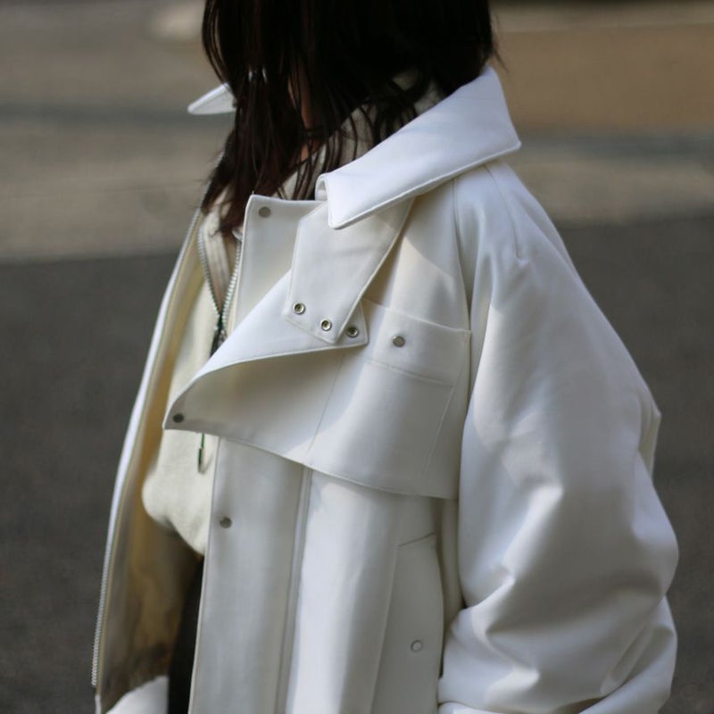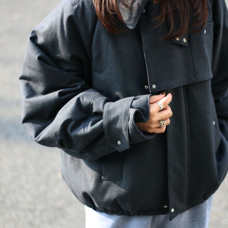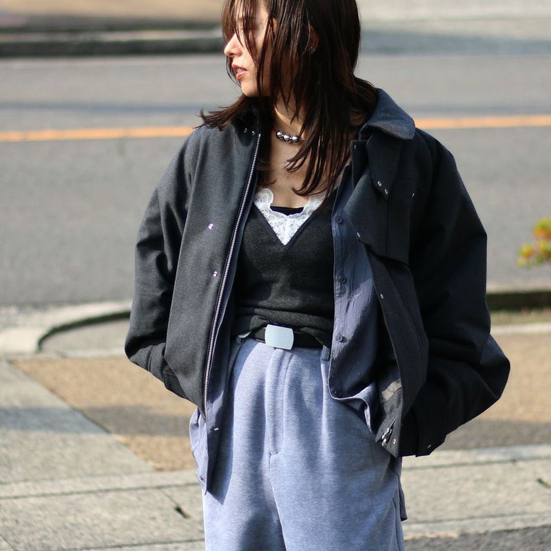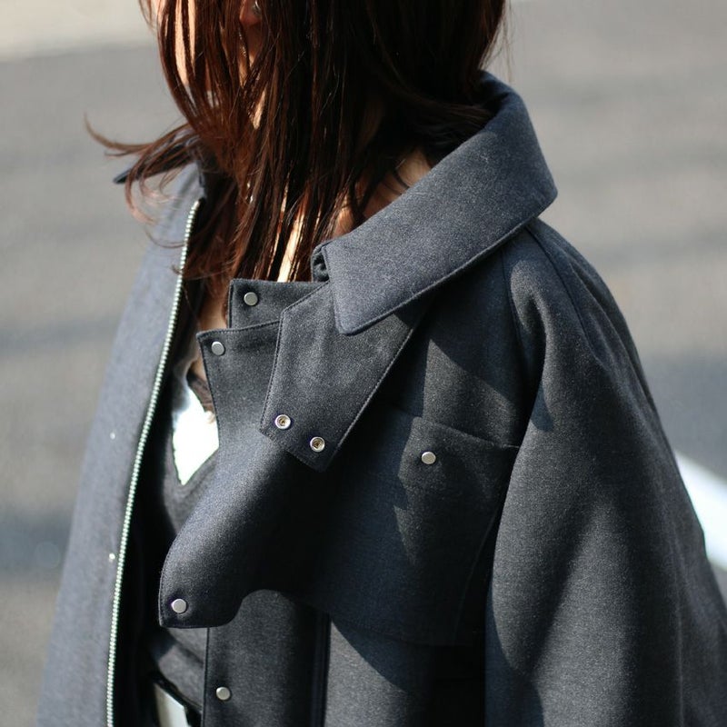 フロントのスナップボタンがさりげないアクセントとなり、シンプルなデザインの中に都市的で洗練されたムードを漂わせます。