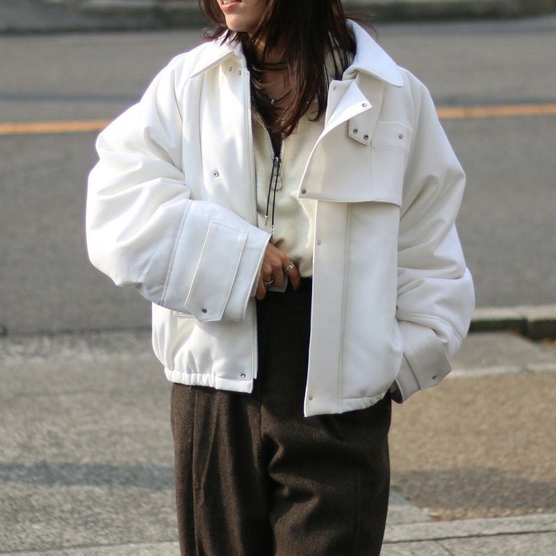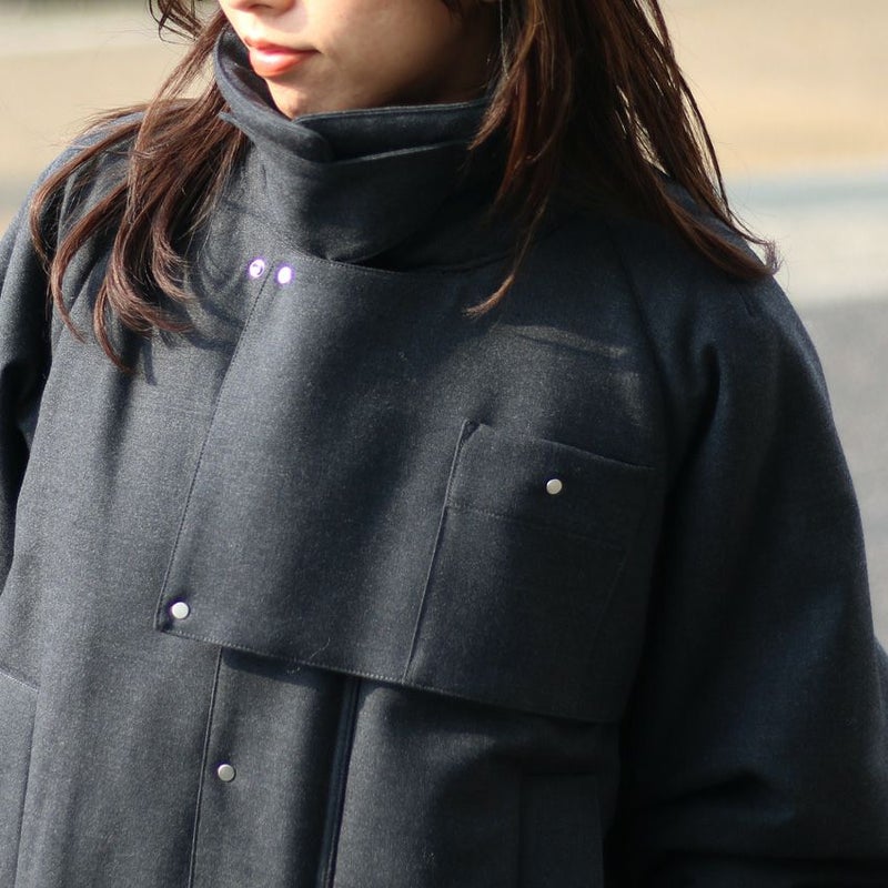 胸元にはガンフラップを配し、ミリタリーのエッセンスを上品に取り入れることで、ほどよい重厚感とモードな雰囲気を演出します。