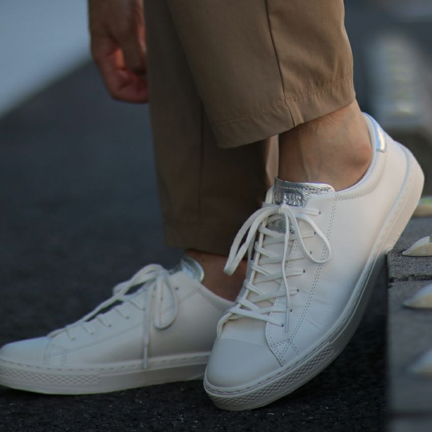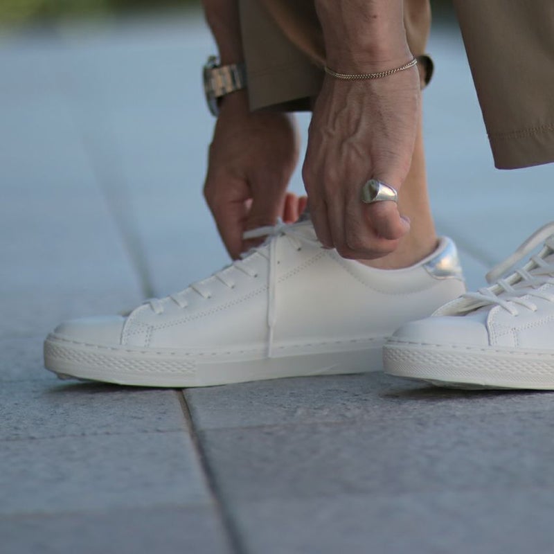 高級感ある純白のレザーが、スニーカーのイメージを覆すようなキレイめな一足に。