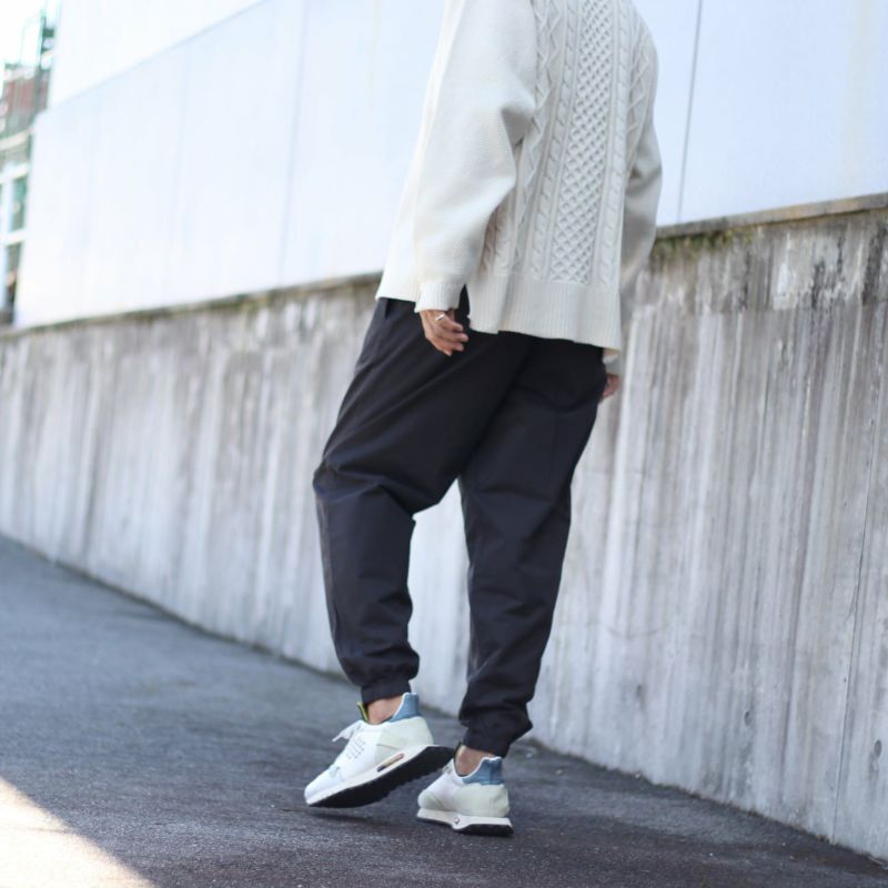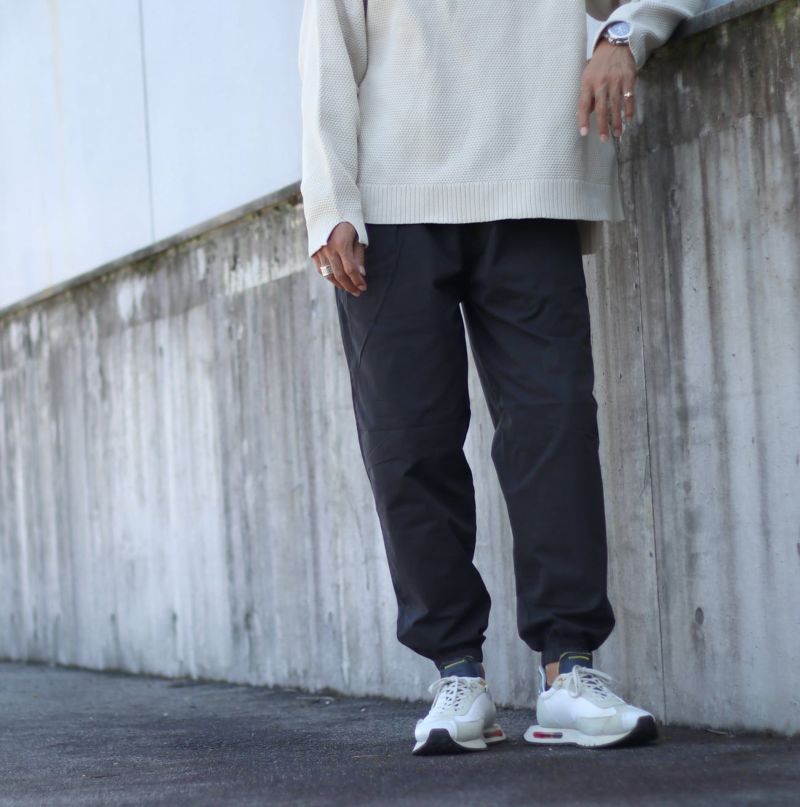 これまでのジョガーパンツとはシルエットを変え、太ももにゆとりを持たせて裾に向けて強くテーパードをかけた今風なシルエットに