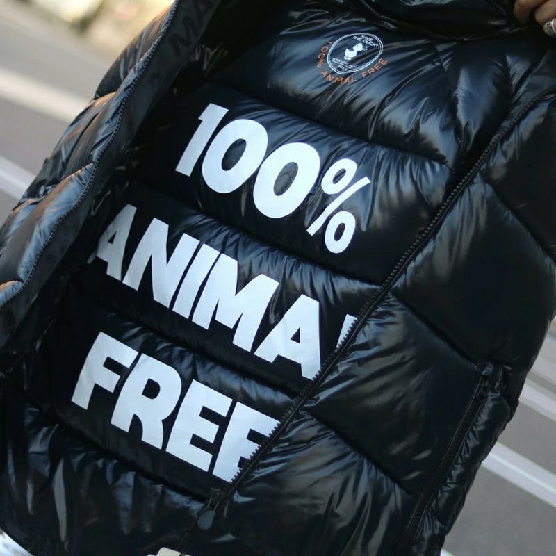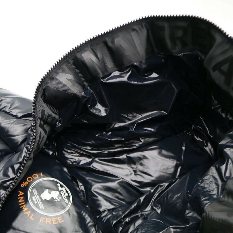 フード内にはロゴのテープを張り、ダウン内側には100% ANIMAL FREEの大々的なロゴがあります。