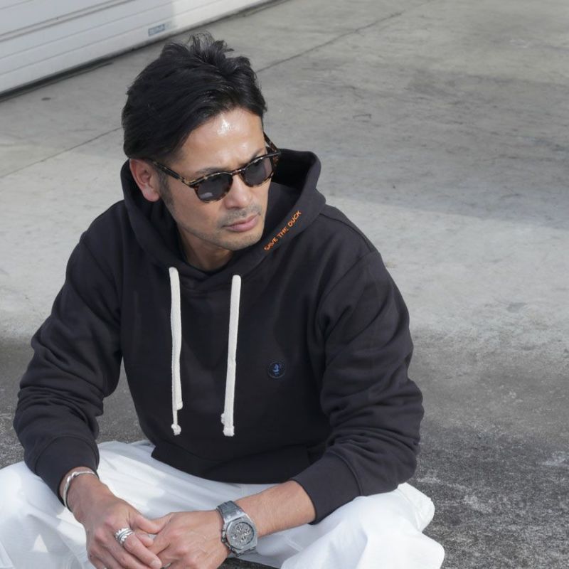 立体的で自立するフーディーにブランドネームのオレンジ刺繍があしらわれており、シンプルながらにアクセントになった一着。