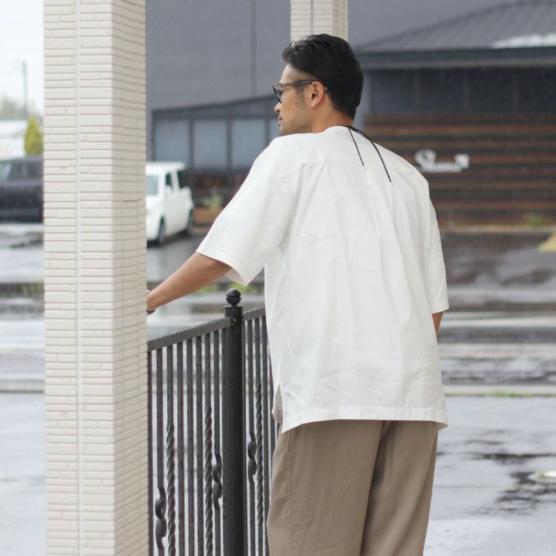 背面を布帛で切り替え、やや前後差を付けたデザインは、単色のトップスでも一枚で様になります。