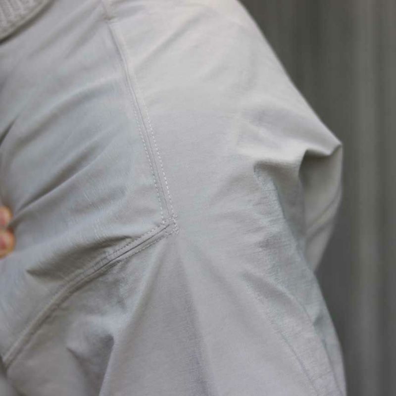 肩付けは前後で異なる縫製にしており、シンプルながらさり気なく変化のあるデザインです。