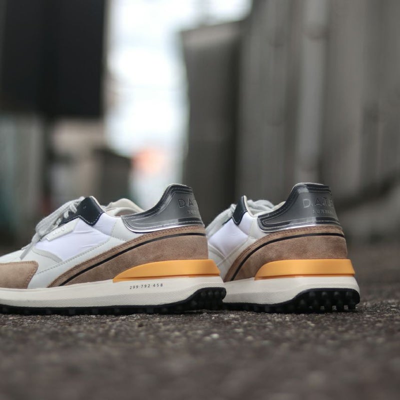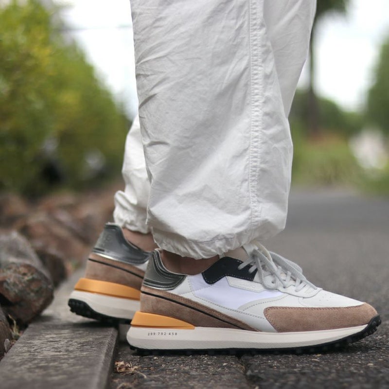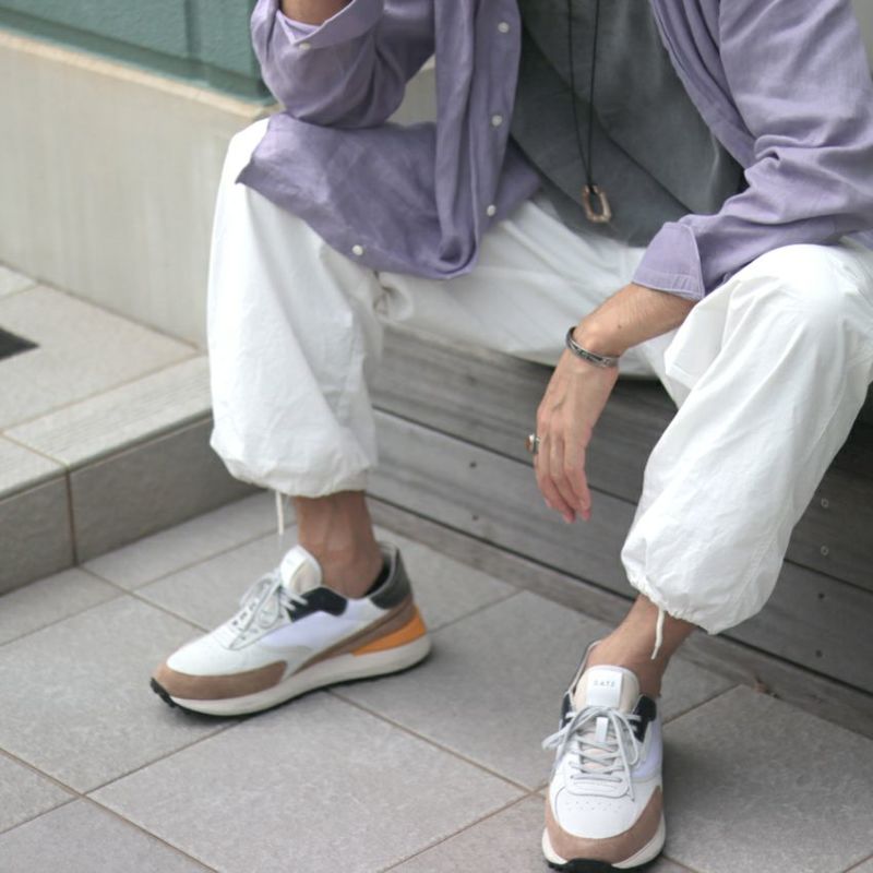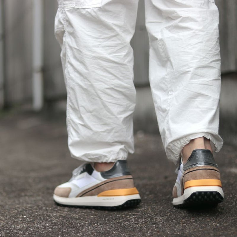 ホワイトを基調としたボディーにブラウン・ブラック・オレンジの配色が爽やかな足元大人な印象を与える仕上がりです。他のブランドと被ることなく、さりげなく個性が演出できます。