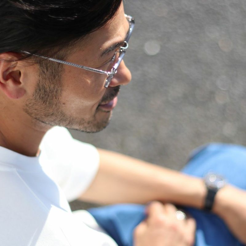 アイスグレーのクリアフレームの眼鏡はどんなコーディネートにも馴染みやすくお洒落 芸能人愛用です。