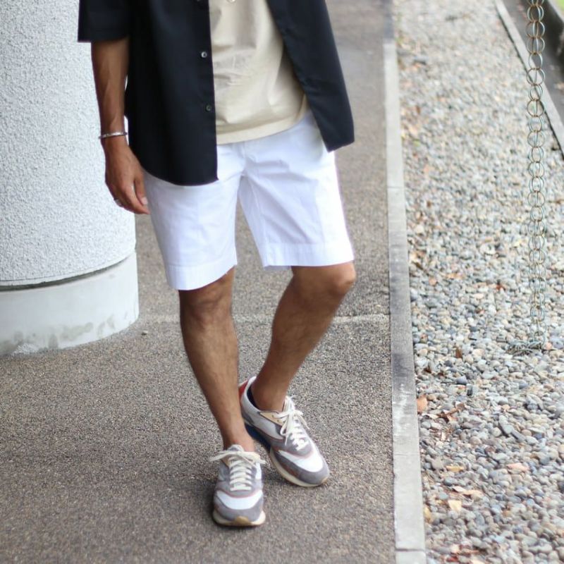ナイロンのようなひんやりとして薄手な生地のチノショーツ。