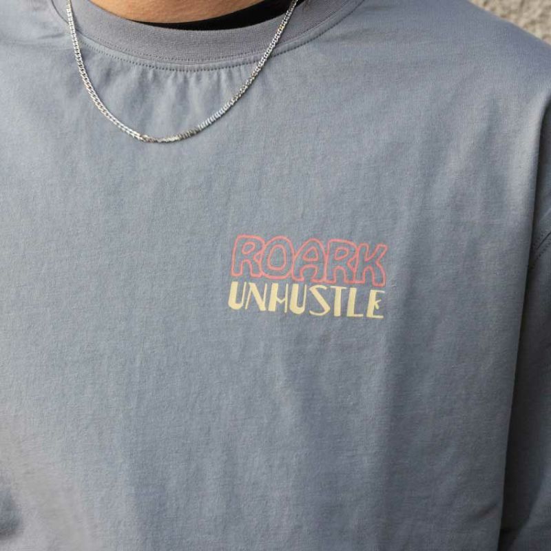 左胸のROARKのロゴの下には"UNHUSTLE"頑張りすぎないことも大切ですと言うメッセージがプリントされています。