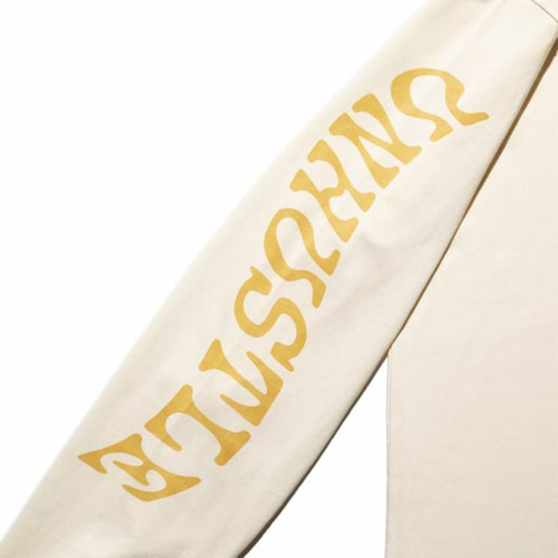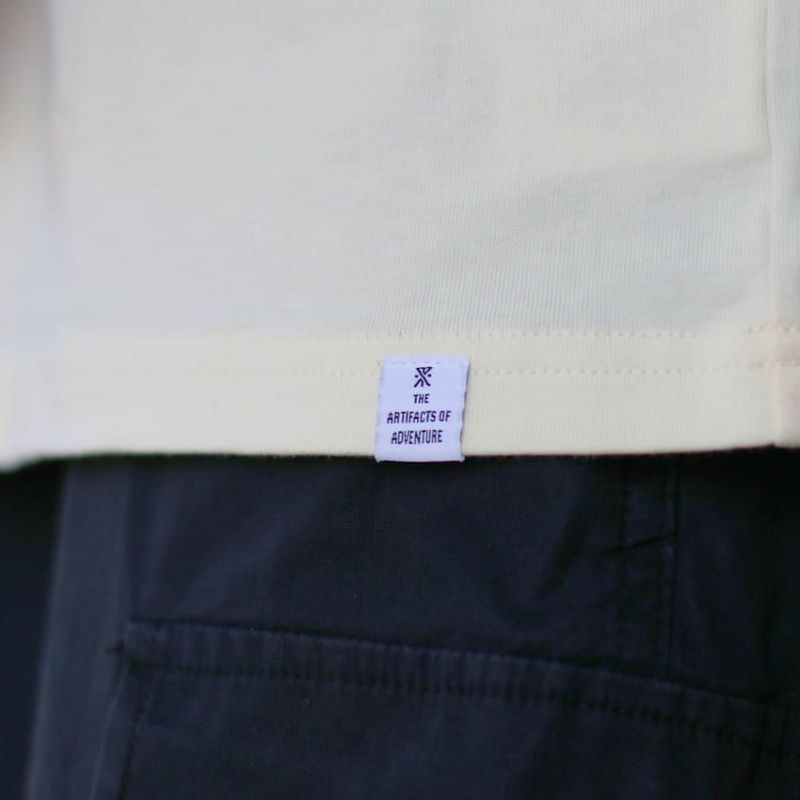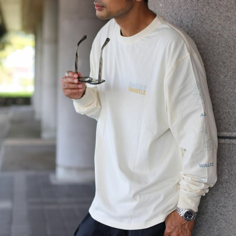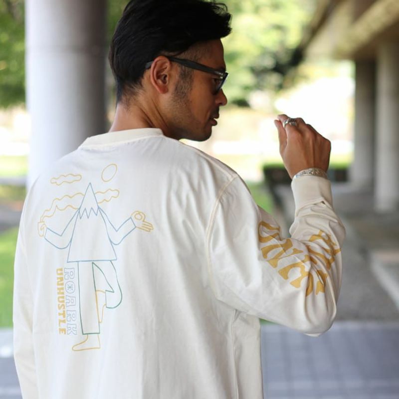ROARKのロゴと"UNHUSTLE"=旅には頑張らない時間も必要というメッセージが胸に込められたデザインの長袖カットソー。