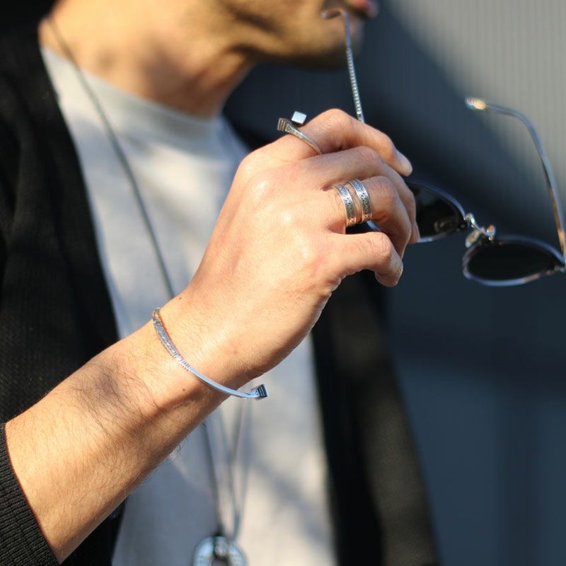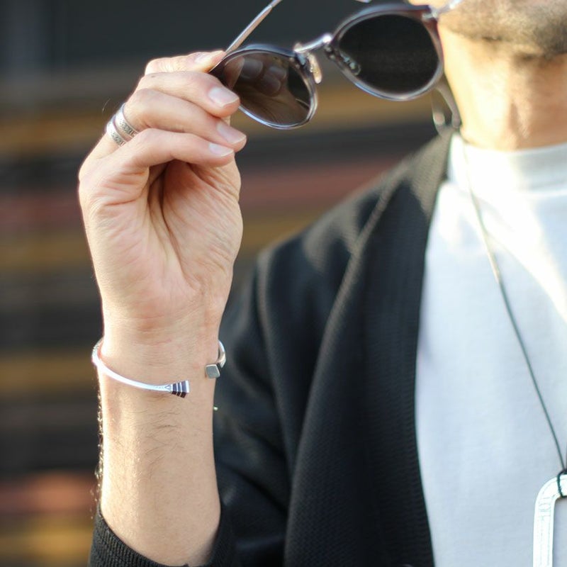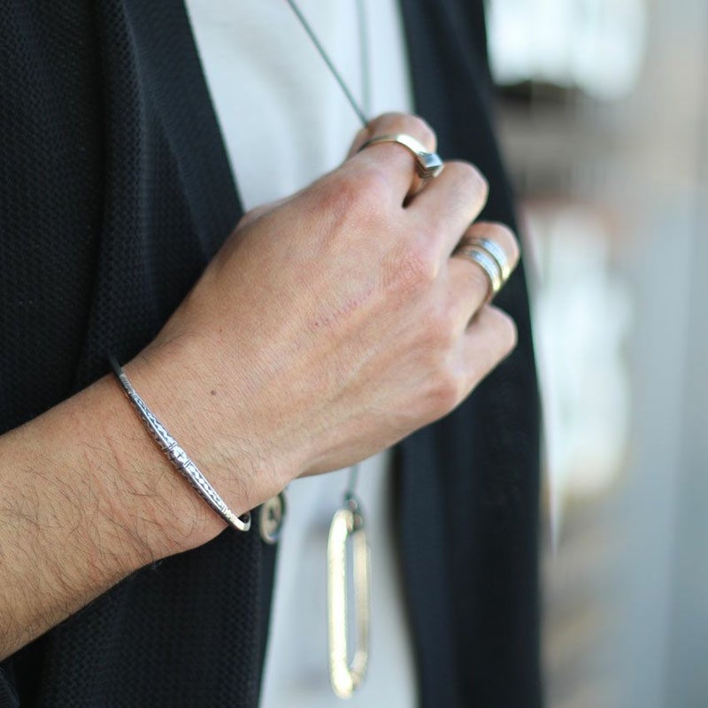目を引くデザインですが華奢なので他のブレスレットと重ね付けしたり、スタイルのアクセントとしてご使用頂けます。