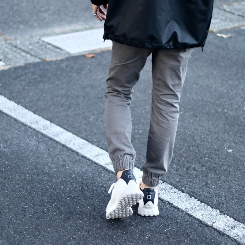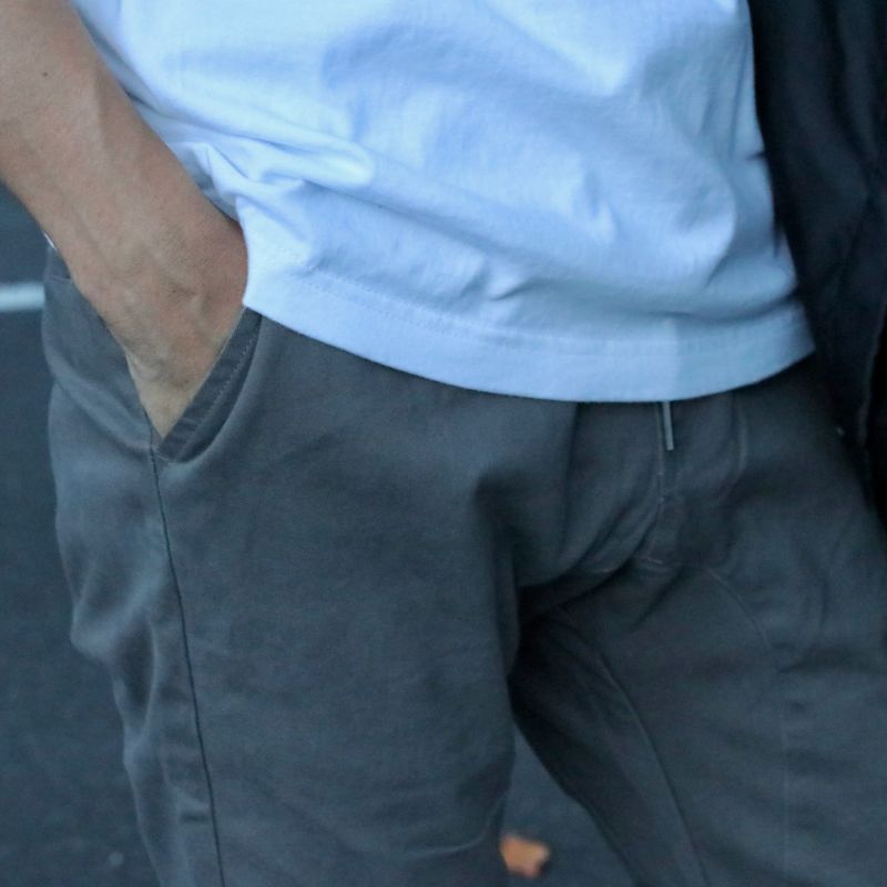 ゼインローブのジョガーパンツの魅力は、やはりピタッと細めのシルエットとジャストレングス