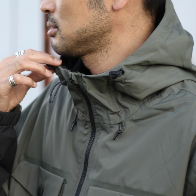 フード、ボディーの裏地にはメッシュ素材を使用しているため通気性が高く、アゴまでしっかり覆うことのできる防水仕様のアウトドアジャケットです。