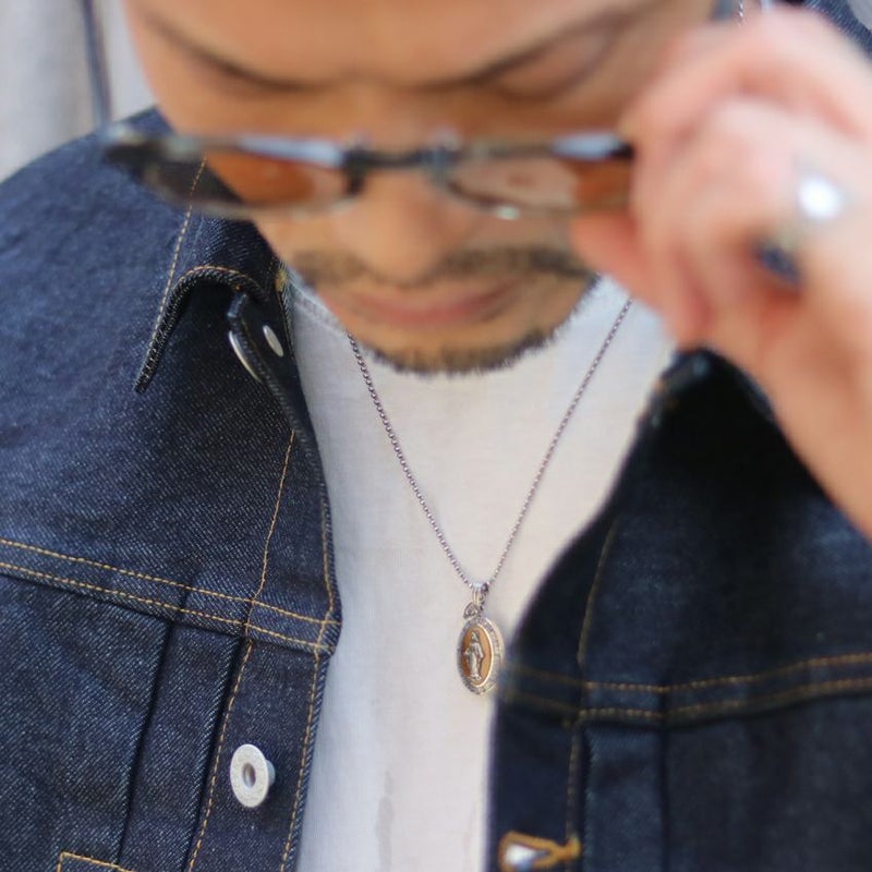 神秘的な輝きを放つタイガーアイを丁寧に削り出し、その中心に聖母マリアを象ったメダイをセットした、存在感あふれるネックレス。