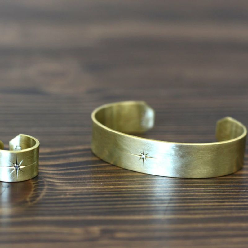 プレーンな真鍮を使用したバングルは単体で着けるのはもちろん、他のブレスレットと重ねづけなどにも幅広く使えます