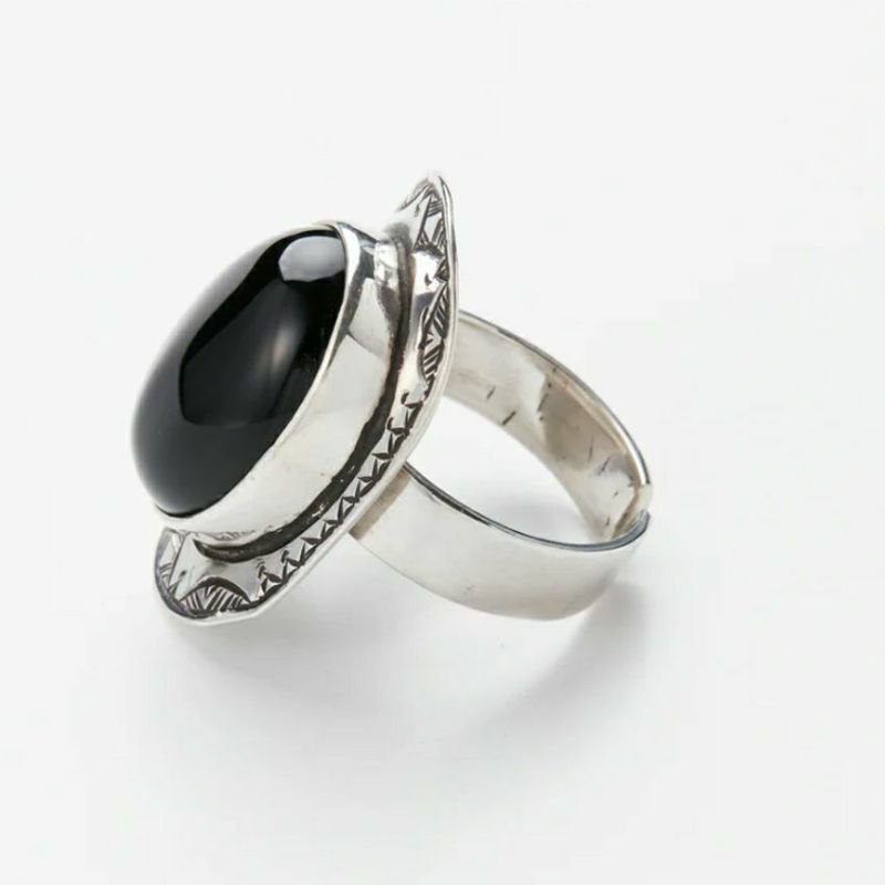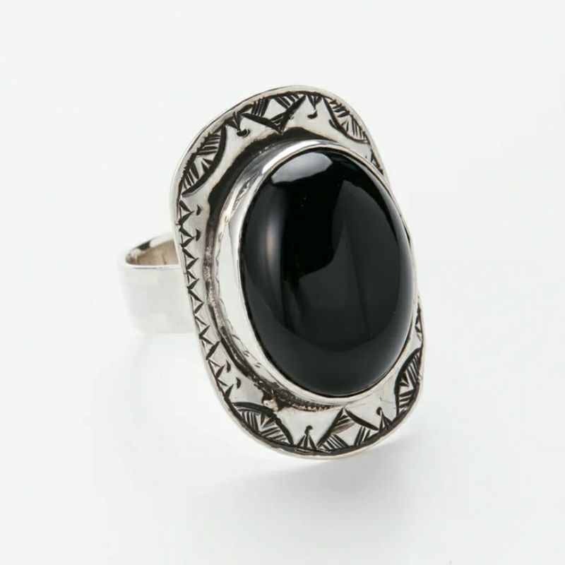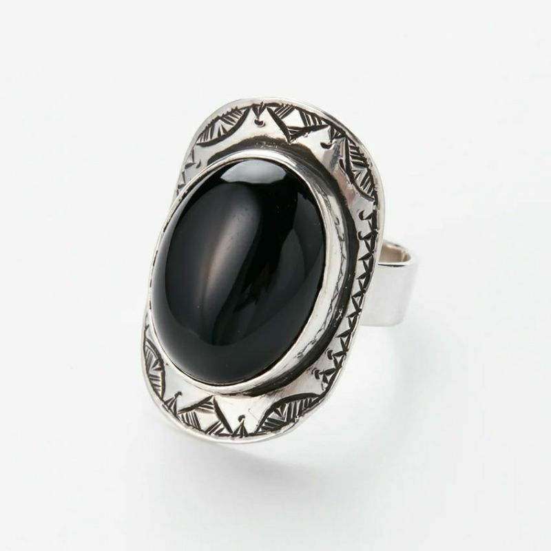 大粒のオニキスと細かに彫られた文様のコンビネーションが美しく、存在感あるデザインは、様々なコーディネートのアクセントとしてご使用頂けます。
