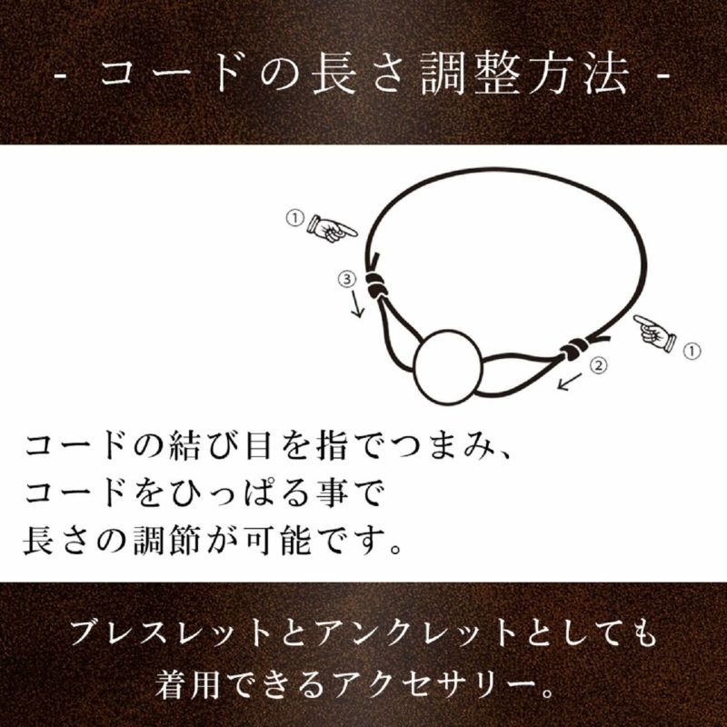結び目を動かすことでサイズの調節ができるようになっており、ブレスレットとしてもアンクレットとしてもお使い頂けます