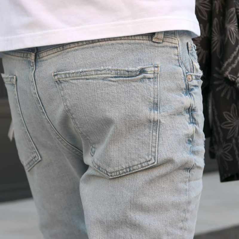 腰回りは少しゆとりを持たせつつ、裾に向かって適度にテーパードを効かせた『適度に細め』のシルエット。またジャストレングスにすることで裾付近のもたつきなくスマートな印象。裾直しが必要な海外ブランドと違って、裾付近のダメージ加工をそのまま生かして着用する事が可能です。