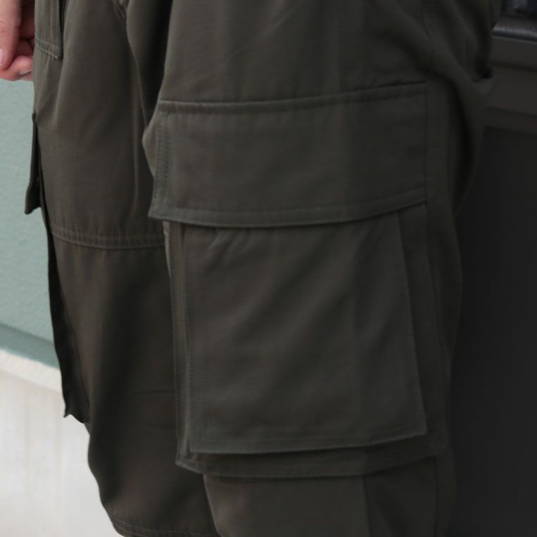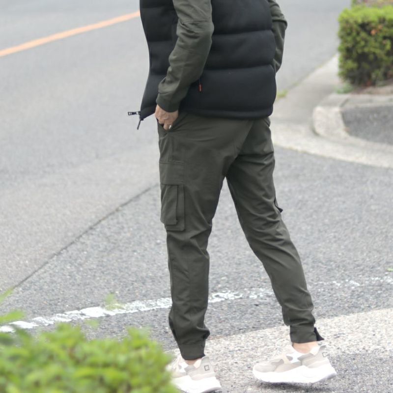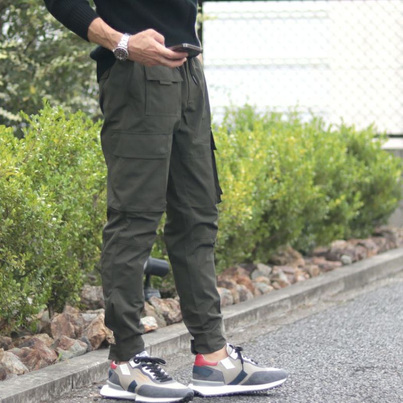 カーゴパンツながら素材も相まってきれいめな印象を与えるボトムスです。