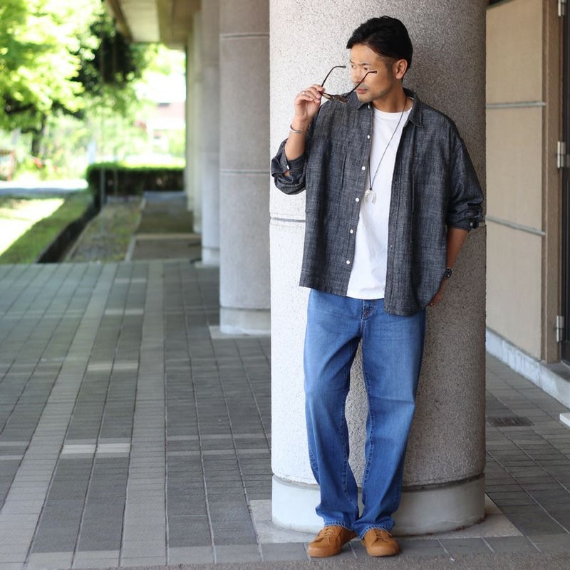DUAL VOICE/デュアルボイス コットンリネンスラブシャンブレーワークシャツ BLACK