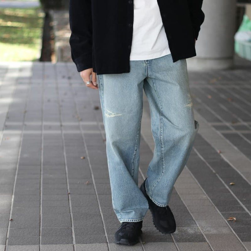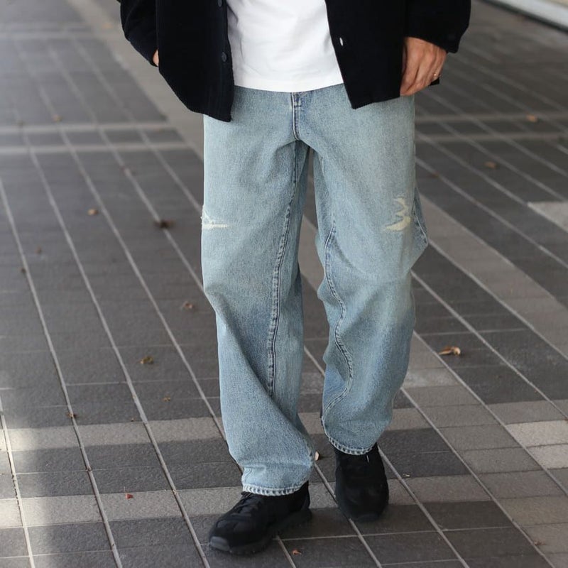 ブリーチカラーにユーズド感のあるデザインが今っぽく、ハーフジップやボアブルゾン、ミリタリーなトップスと好相性です。