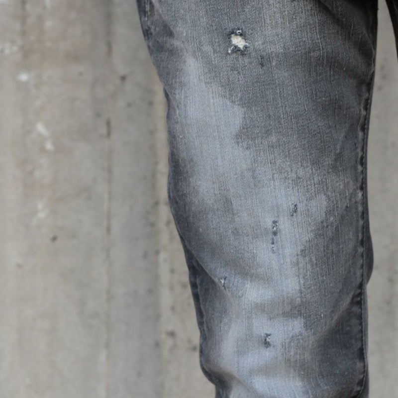 全体的に小さめのクラッシュ加工とペンキ加工が施されていて、裾はカットオフ仕様。