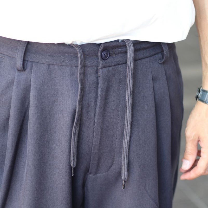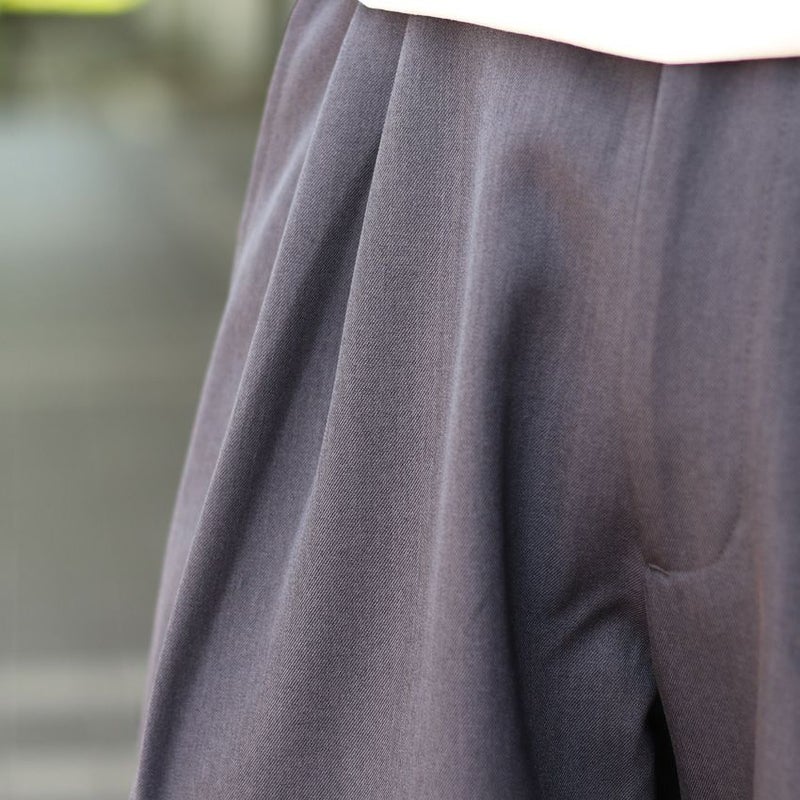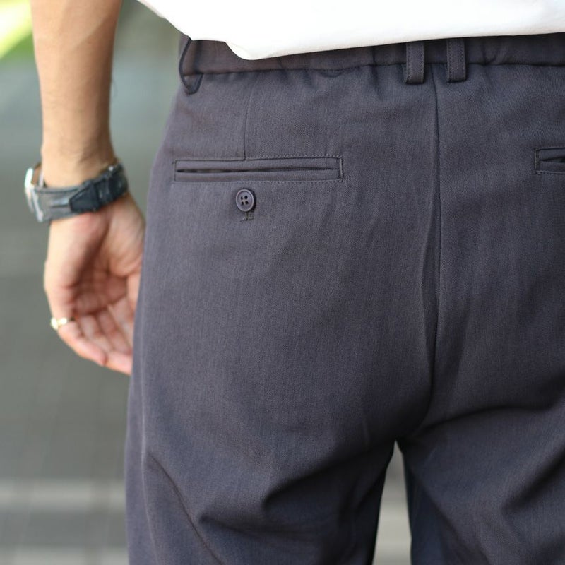フロントのファスナー開きや、ベルトループ、タックデザインなどの本格仕様を取り入れて、きちんと感を演出。
