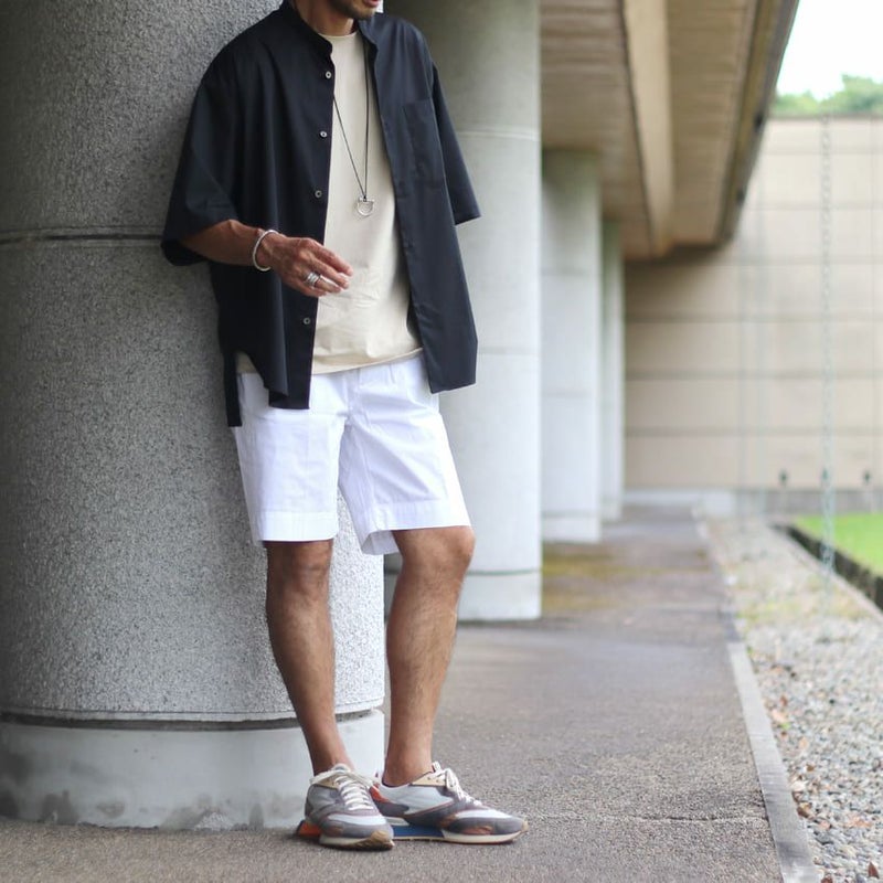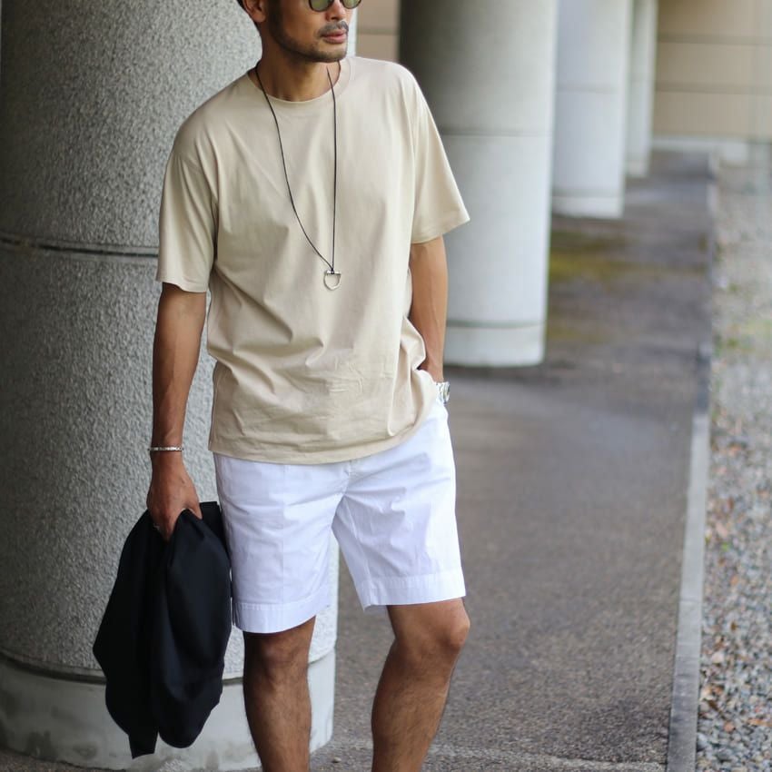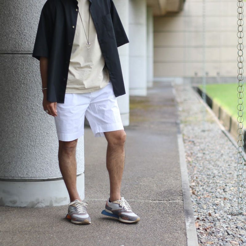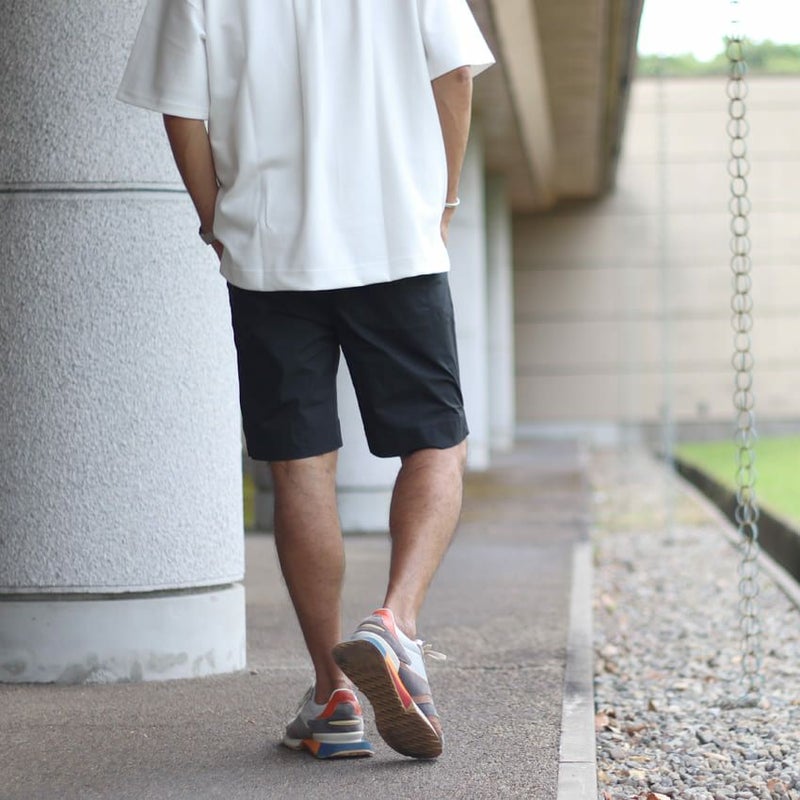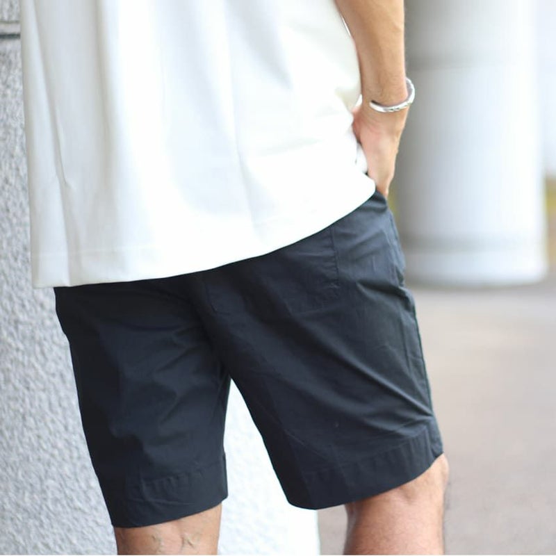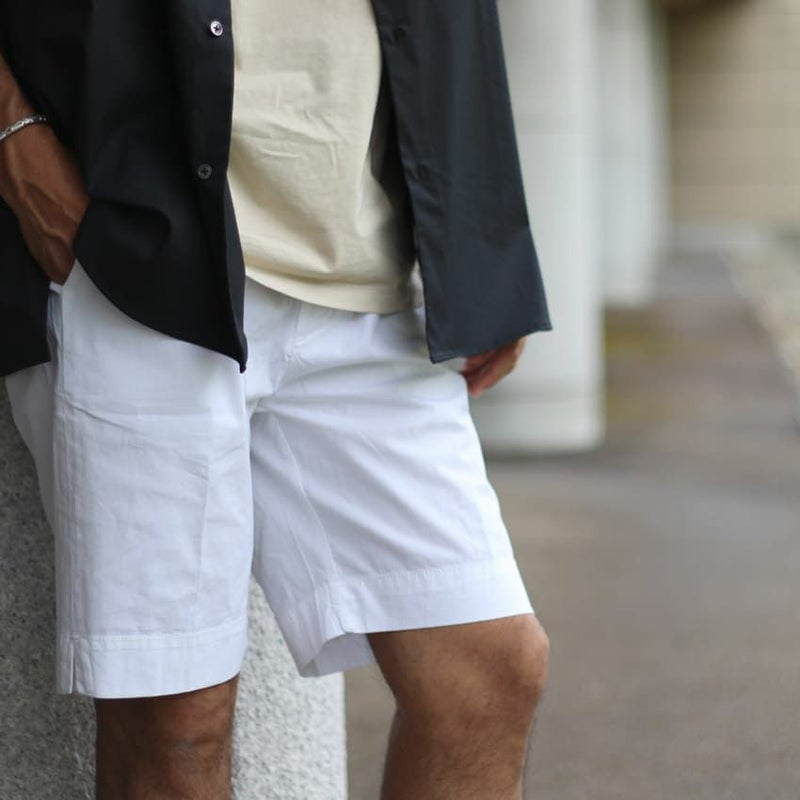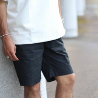 ナイロンのようなひんやりとして薄手な生地のチノショーツ。