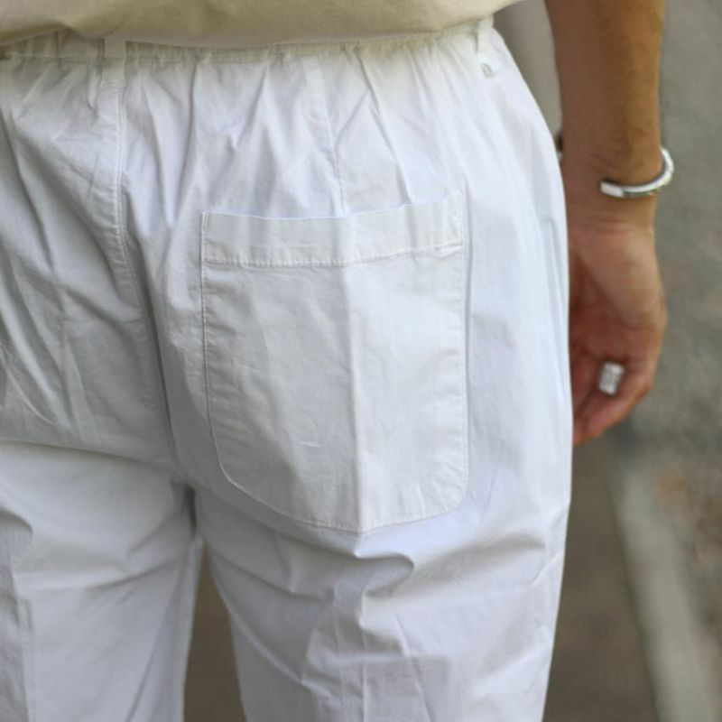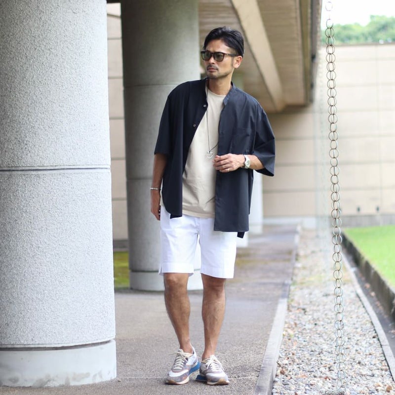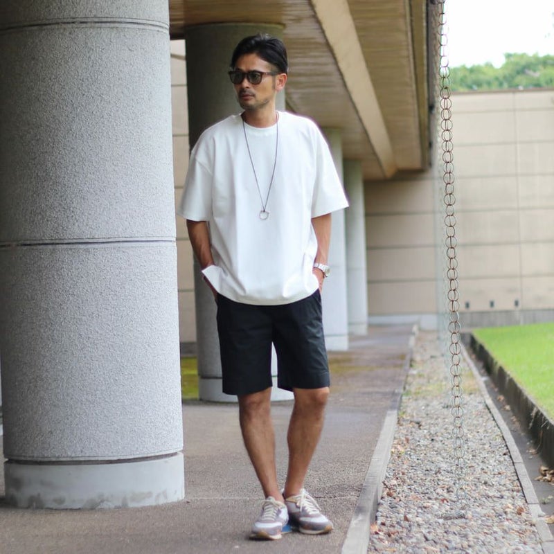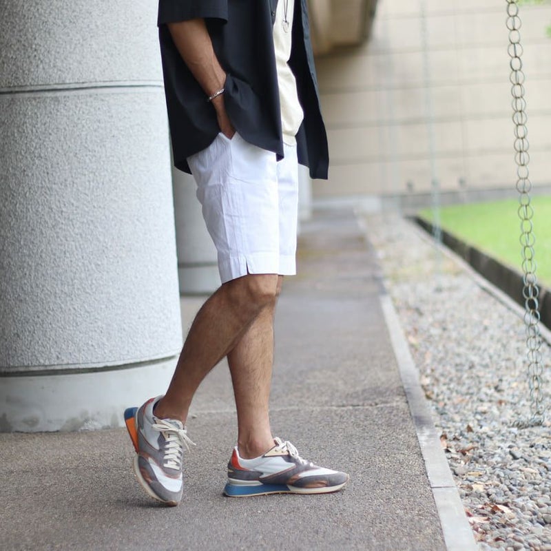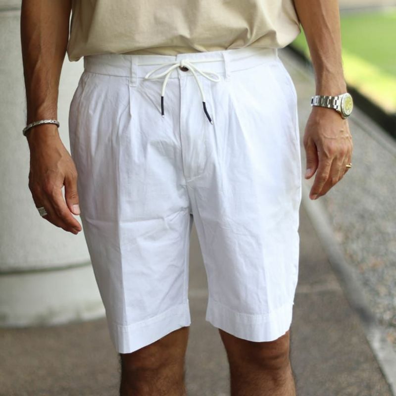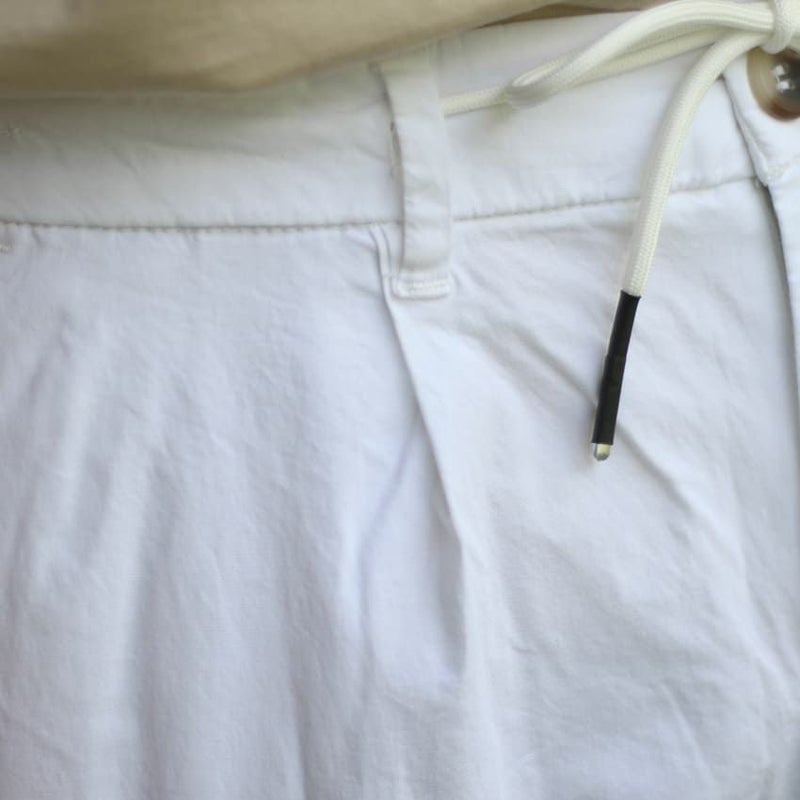 ナイロンのようなひんやりとして薄手な生地のチノショーツ。