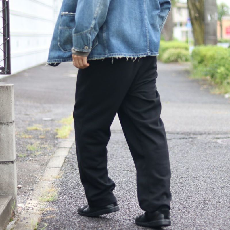 後ろ身頃はヒップまわりをすっきり見せたワイドストレートシルエットを採用し、前身には2本のタックを入れることでゆとりを確保。
