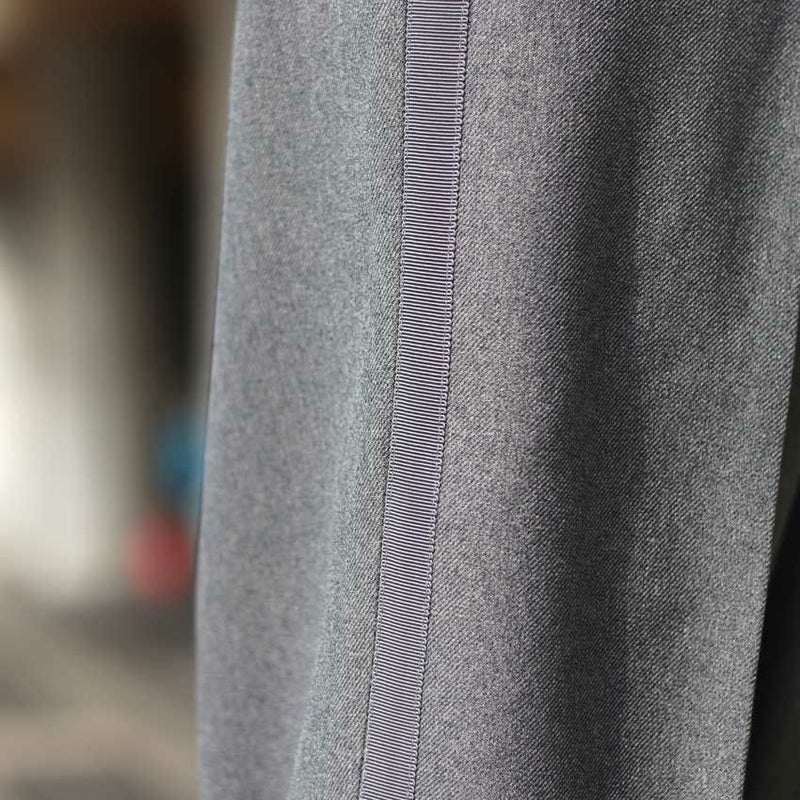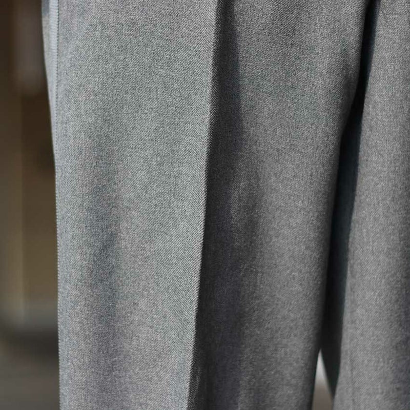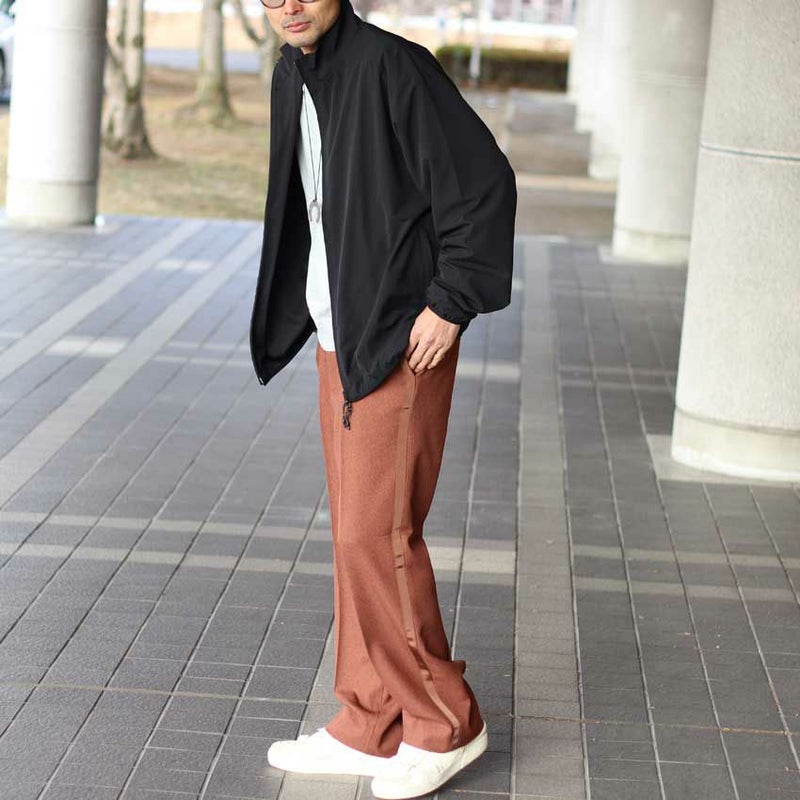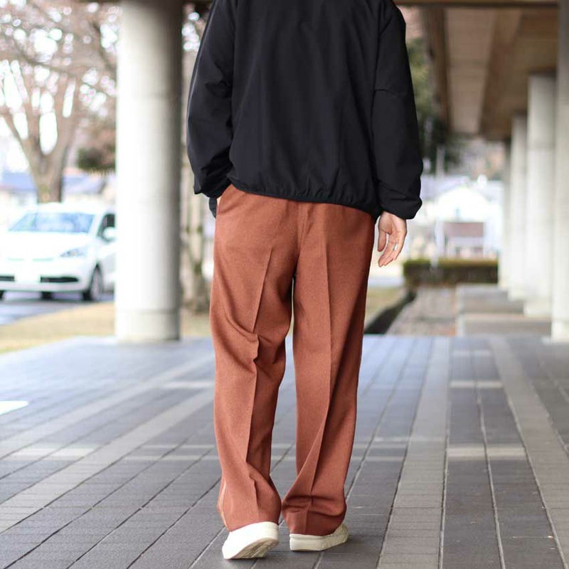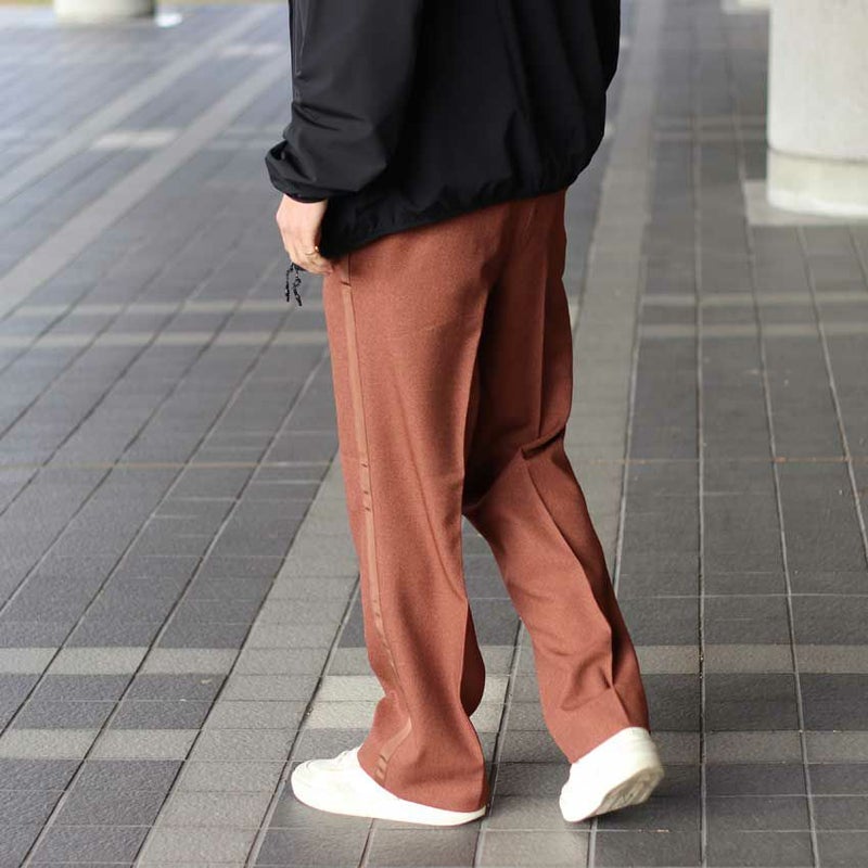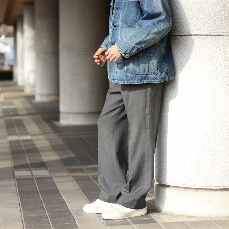 サイドテープでラインのデザインを作りながらもワイドシルエットのスラックスをベースにしているため、きれいめな印象を受けます。