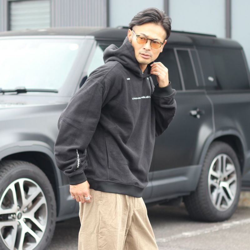 このフリースフーディは、単なる防寒具ではありません。軽さと保温性を兼ね備えた中肉厚のフリース素材を採用し、肌触りはソフトで滑らか。