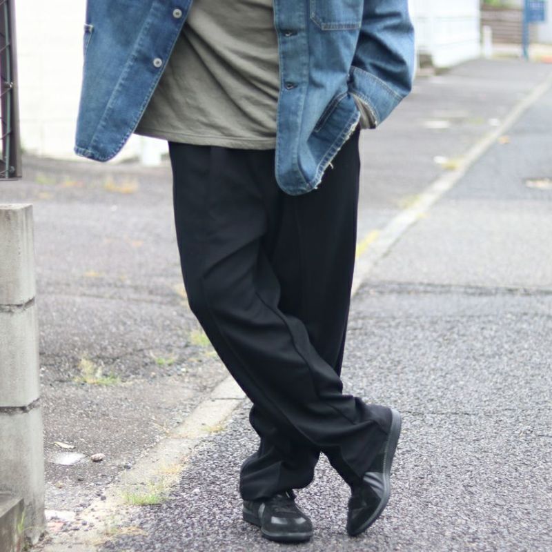 後ろ身頃はヒップまわりをすっきり見せたワイドストレートシルエットを採用し、前身には2本のタックを入れることでゆとりを確保。