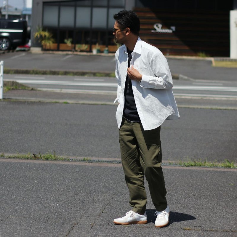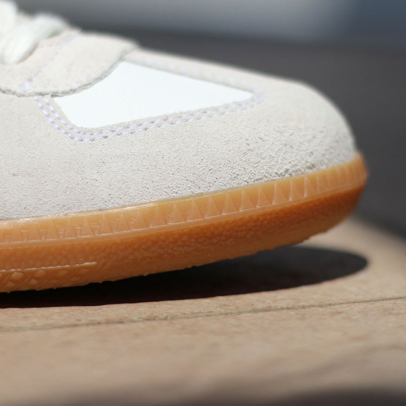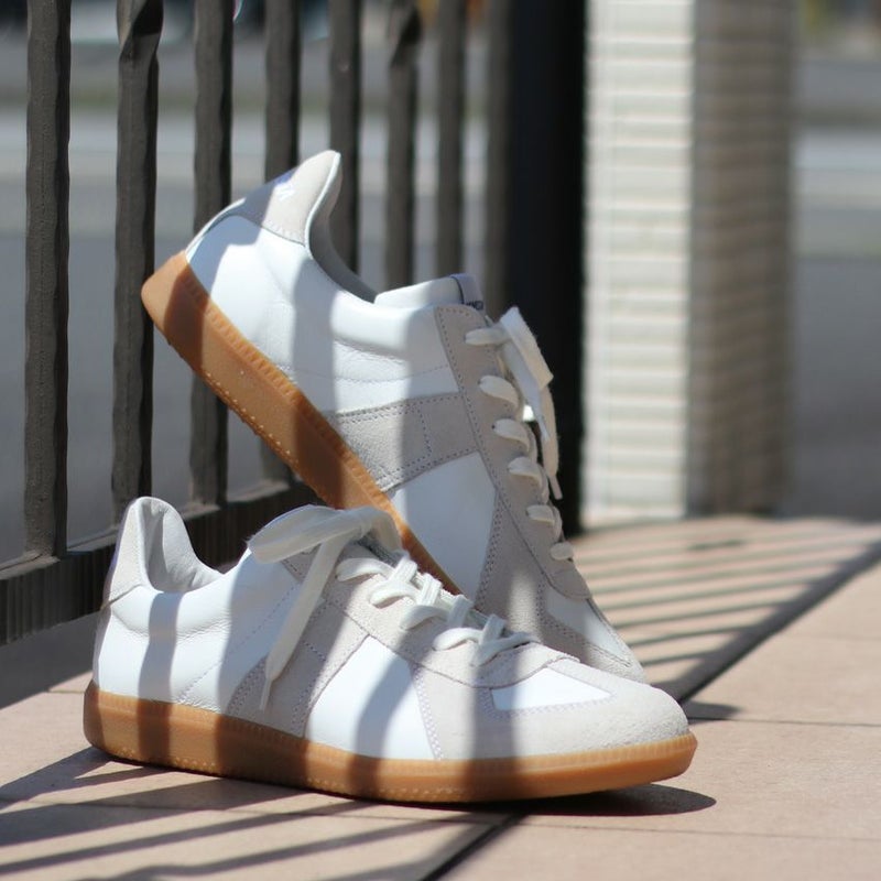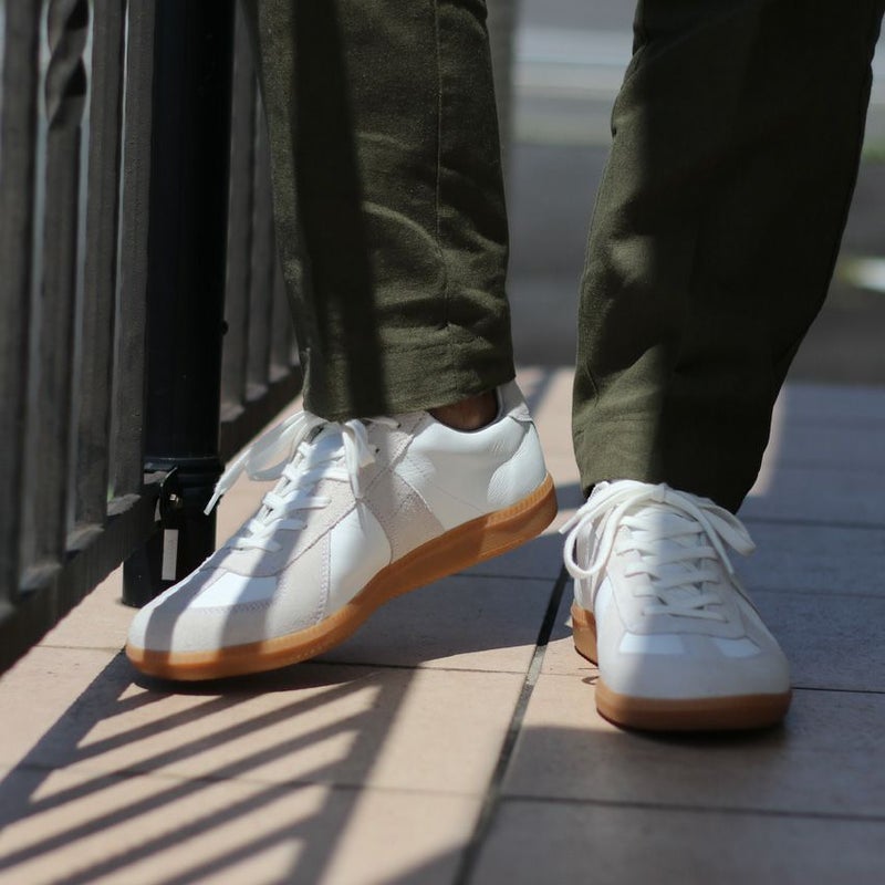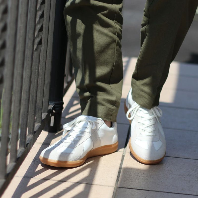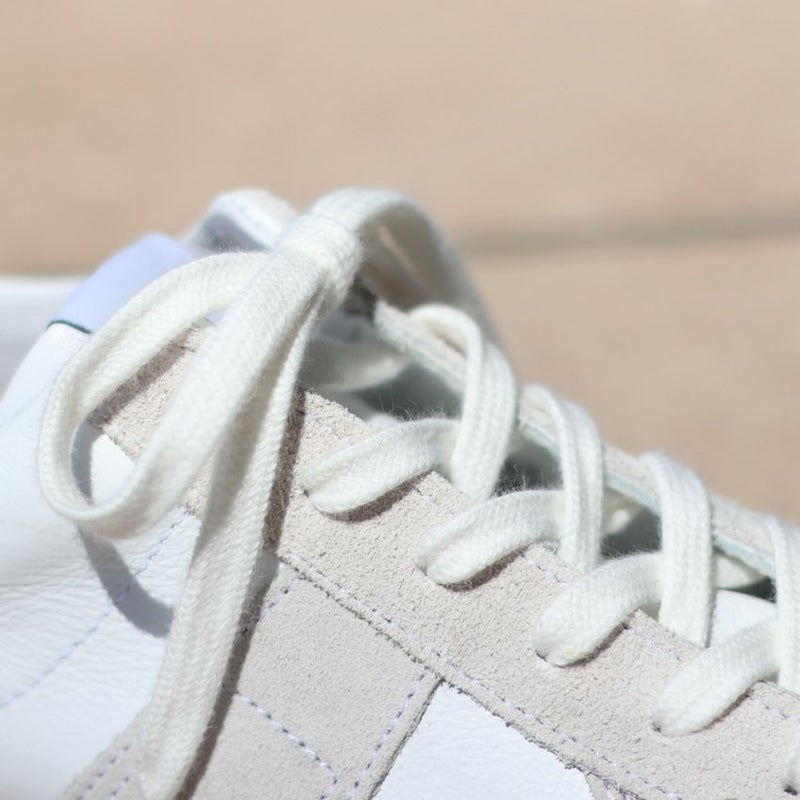 ホワイトのレザーをベースに、ベージュのスエードをあしらったスニーカーは、カジュアルさと品を兼ね備えた仕上がりに。
