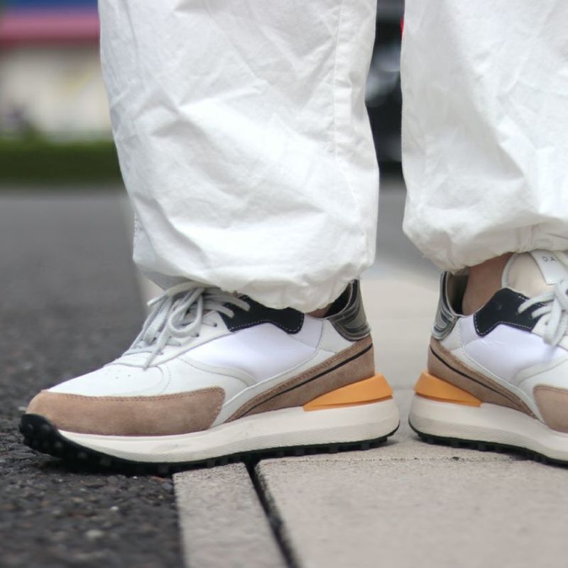ホワイトを基調としたボディーにブラウン・ブラック・オレンジの配色が爽やかな足元大人な印象を与える仕上がりです。他のブランドと被ることなく、さりげなく個性が演出できます。