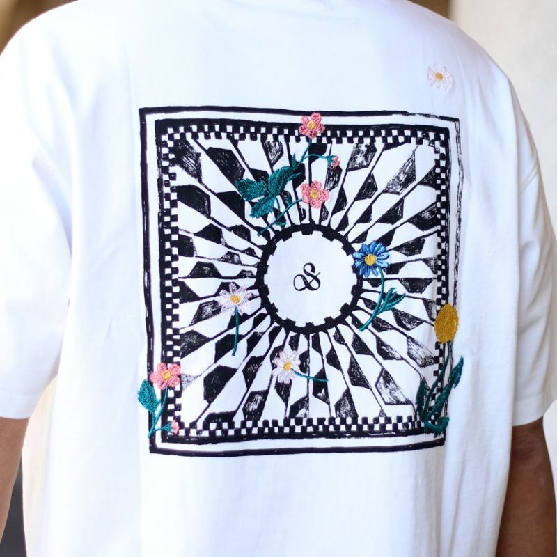 背面には特徴的な幾何学模様がされたスクエアにタンポポなど様々な花を刺繍で落とし込んだスコッチアンドソーダらしい斬新なデザイン。