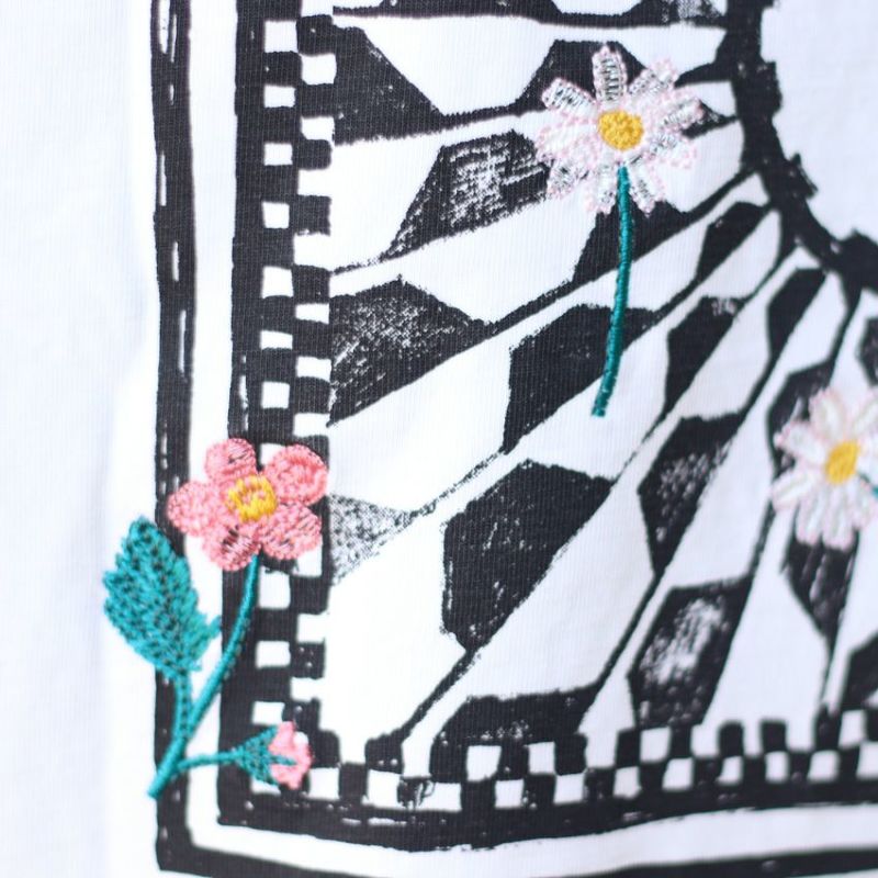 フロントのボックスロゴにはピンクとブルーの色鮮やかな花を刺繍でデザイン。
