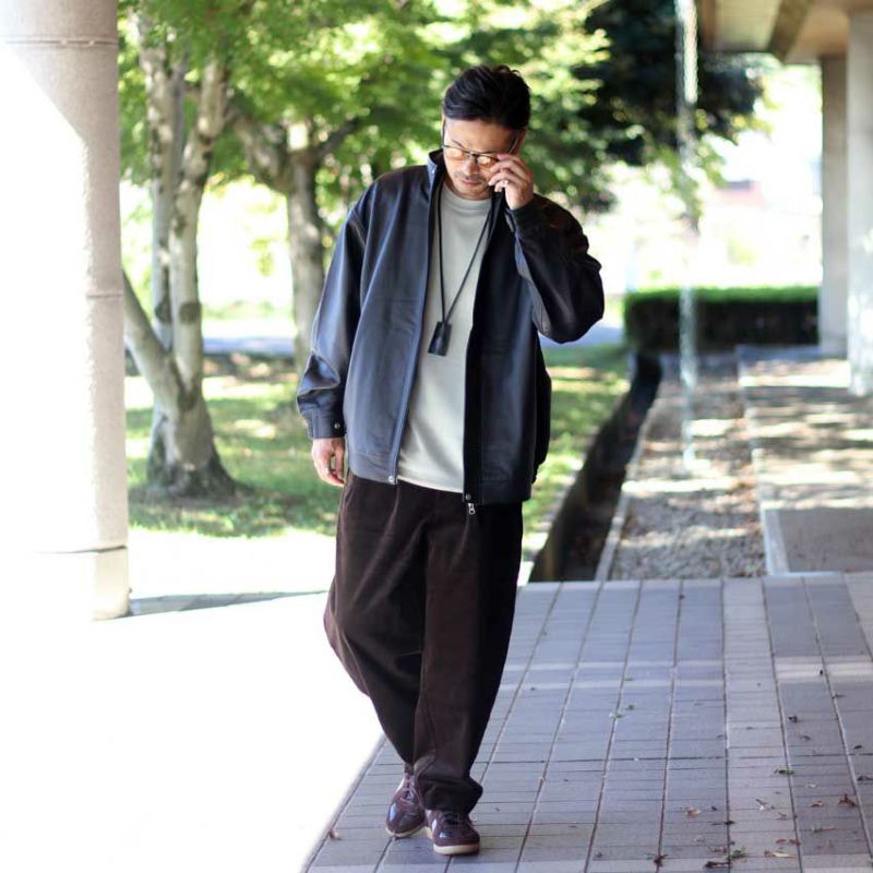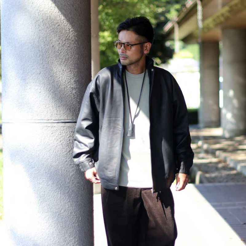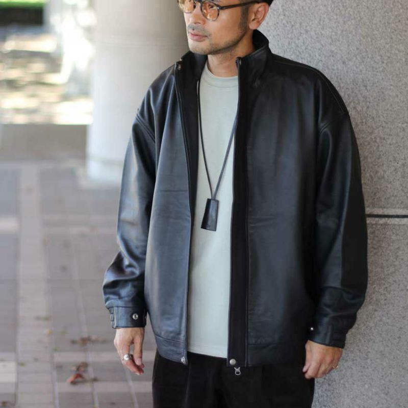 90年代古着を思わせる、男らしさと抜け感を兼ね備えたレザーブルゾン 。