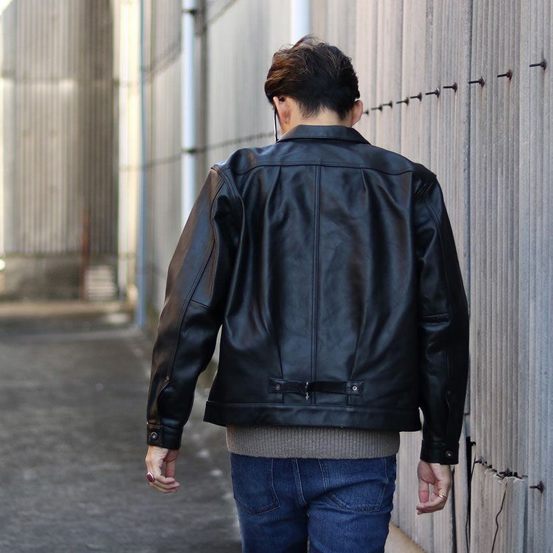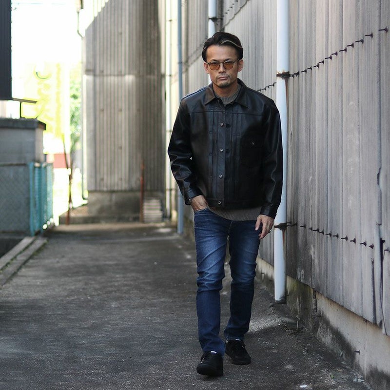 リーバイスが1930年代に初めて世に送り出したデニムジャケット(1stモデル)をレザーで再現。前立てのボタン脇に施されたヒダ(アクションプリーツ)や、背中のバックルベルト式のアジャスターなど、男のオシャレ心をくすぐるデザイン。