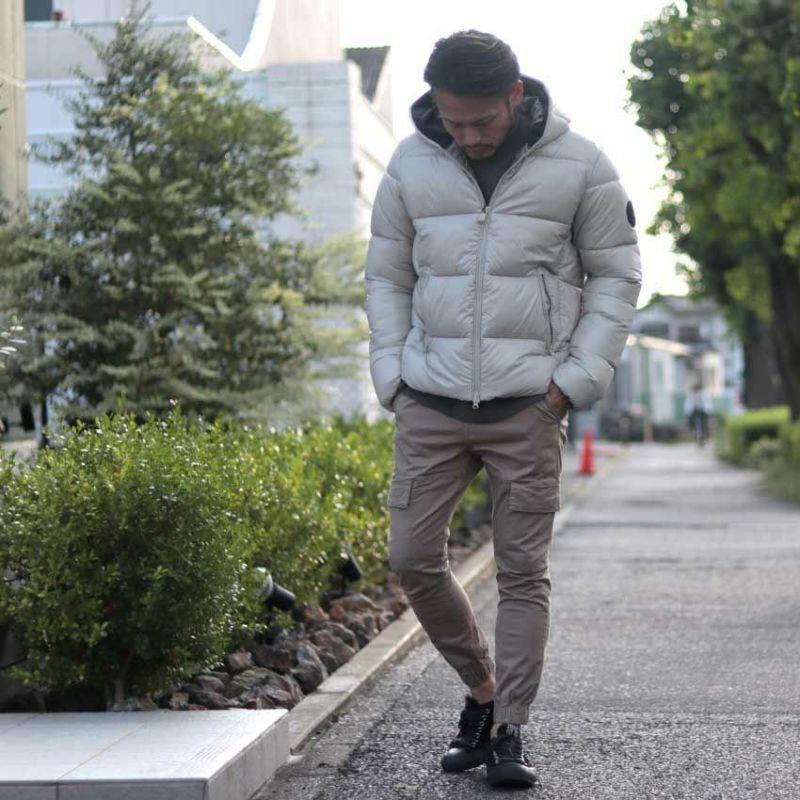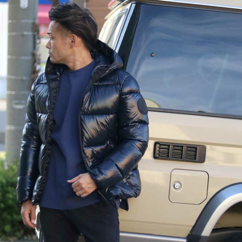 また、左袖にはマットラバー素材のブランドロゴを配置。シャイニーナイロン素材とマットラバーの組み合わせがとても高級感のある仕上がりです。非常に軽量でコンパクトな着心地と、高密度構造による優れた防風性能で、真冬でも暖かにお過ごし頂けます。