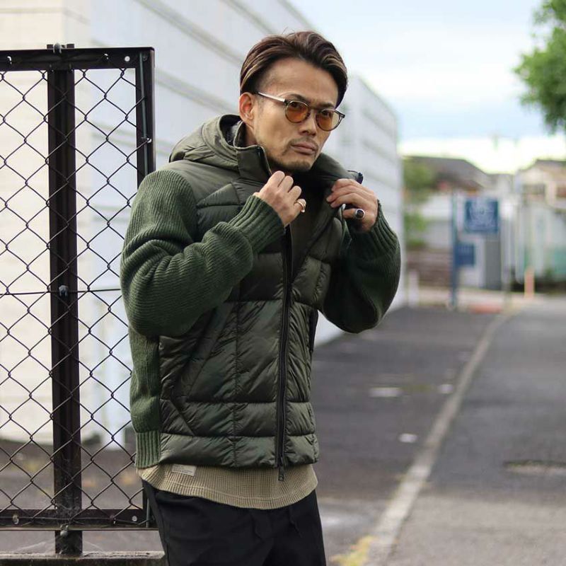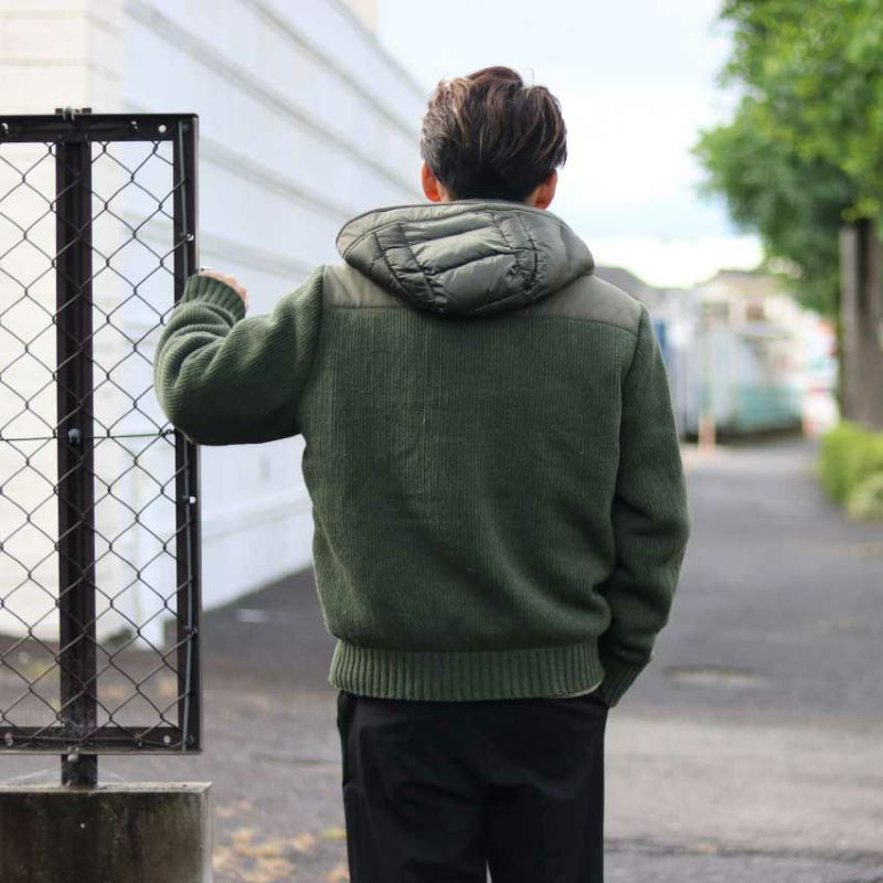 中綿アウターの優れた保温性を保ちながらニット素材の切り替えにより、