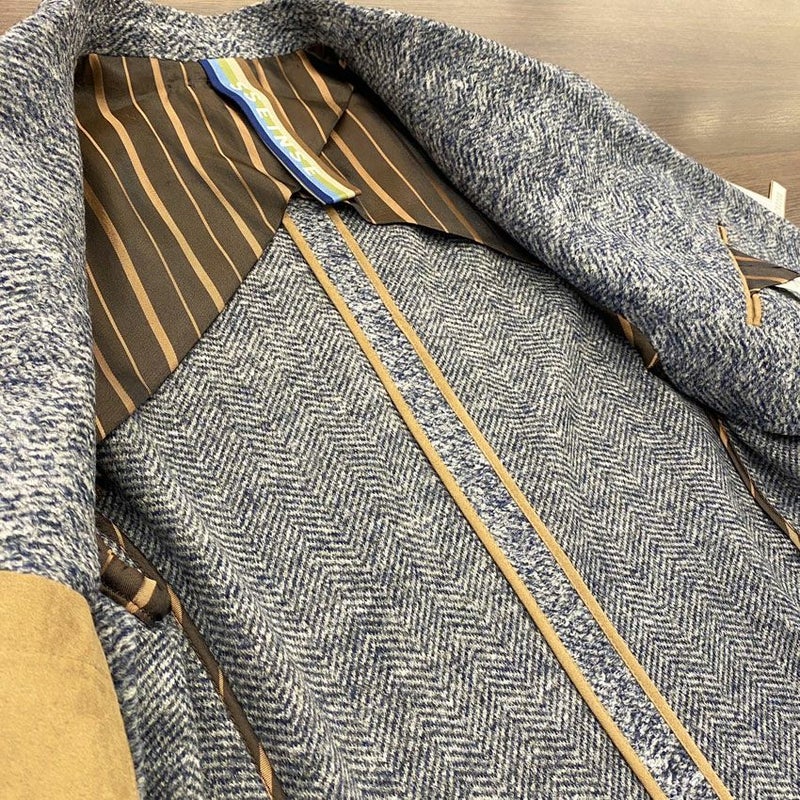 裏地にはオリジナルのサテンストライプの生地を切り替えたり、スウェードのパイピング、ポケットをあしらうことで、インポートブランドらしいギミックの効いたディテールに。