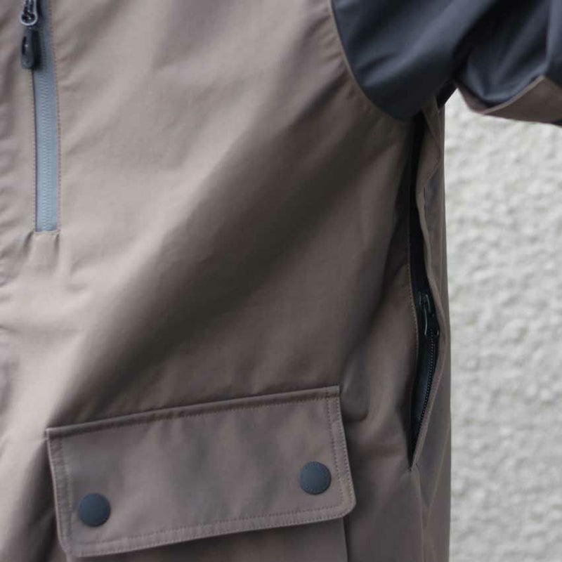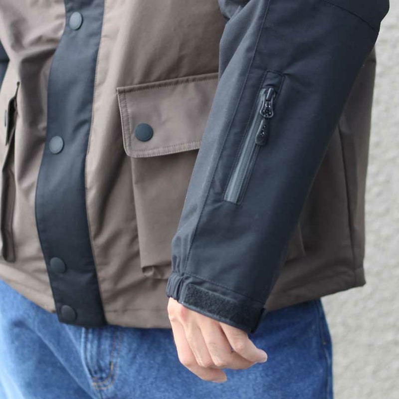 表地には高性能な透湿防水素材のブリザテック、両胸、左袖口、脇のベンチレーションには止水ジップを採用しており高い防水性を発揮します。