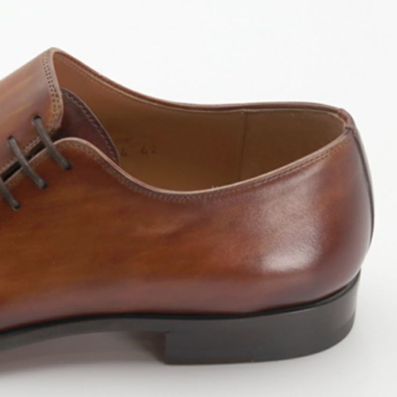 マグナーニのシューズに用いられる「パティーヌ仕上げ」により、グラデーション上に深みのある色合いの美しい表面が特徴です。色を何層にも重ねて染め上げており、手作業ならではの独特のムラ感が高級感を感じさせるポイントです。