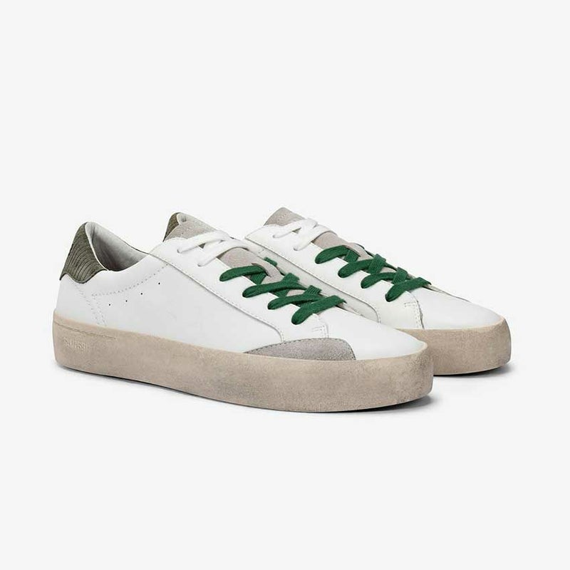 スマートな印象のコートスニーカーをベースに、ダメージ加工を施したソールとダークグリーンの配色がアクセント。