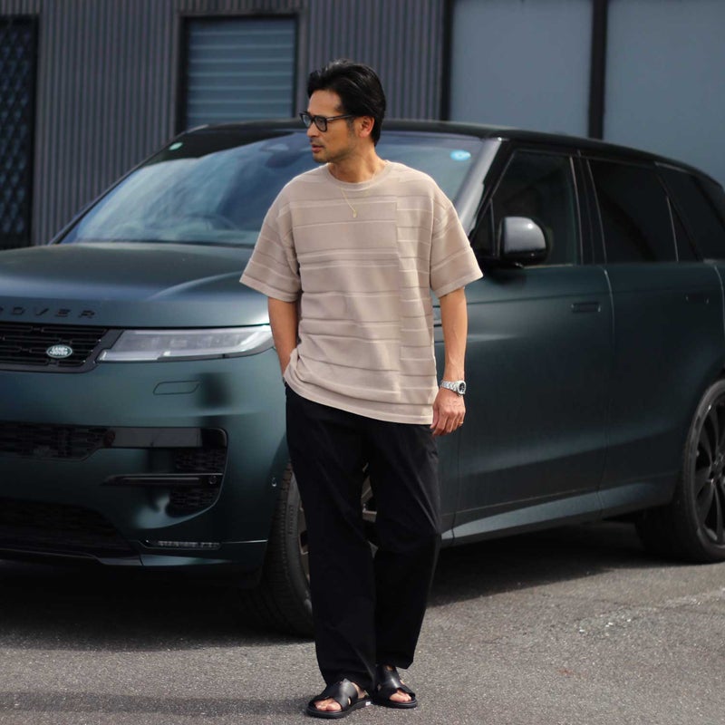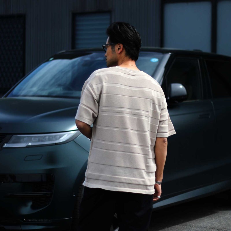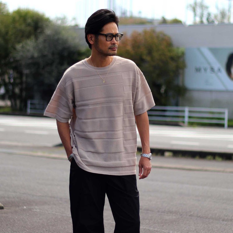 パネル状に切り替えた半袖のサマーニット。 凹凸で演出した立体的な変則ボーダー柄は、単色ながらに一枚でもお洒落に見せてくれます。