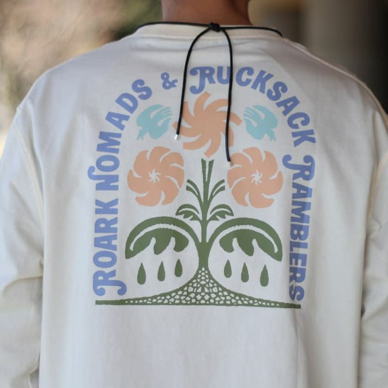 右の袖にはロゴを、左の袖には、鳥やフラワープリントをあしらったユニークなデザイン。