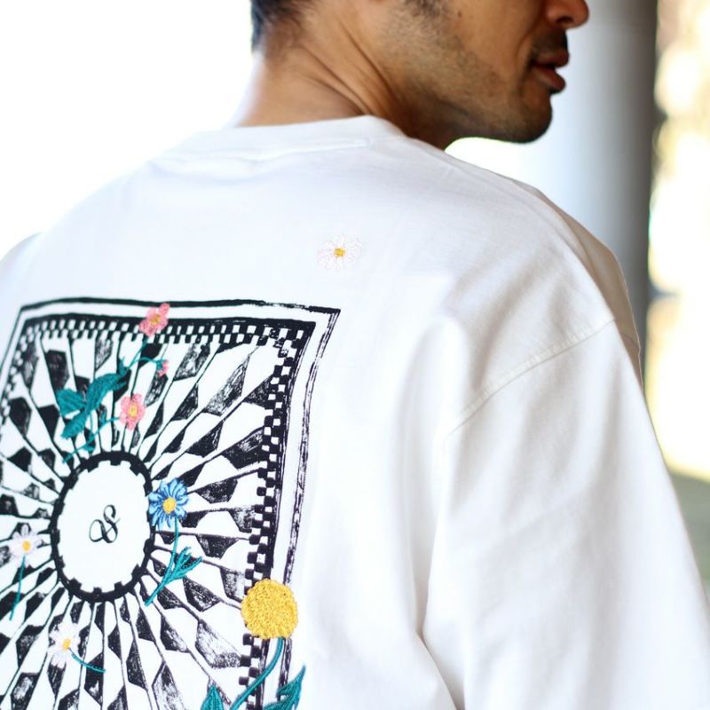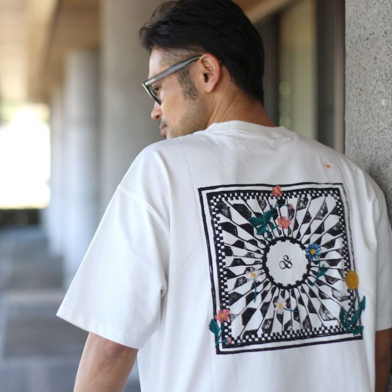 背面には特徴的な幾何学模様がされたスクエアにタンポポなど様々な花を刺繍で落とし込んだスコッチアンドソーダらしい斬新なデザイン。