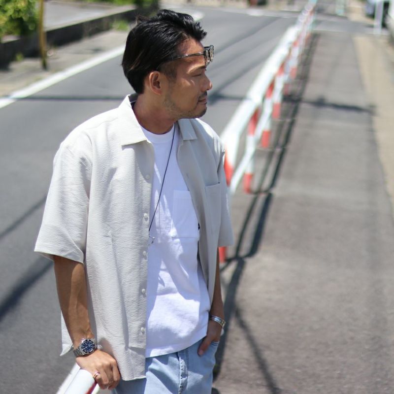 ボトムスはデニムとの相性が良く、半袖シャツと合わせると程良いカジュアル感を演出できます。