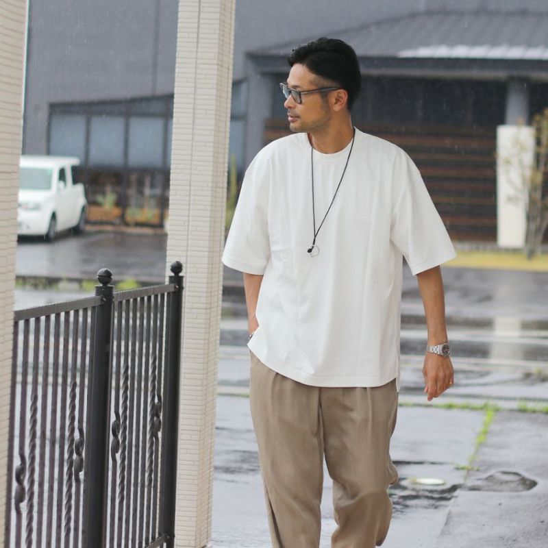 背面を布帛で切り替え、やや前後差を付けたデザインは、単色のトップスでも一枚で様になります。